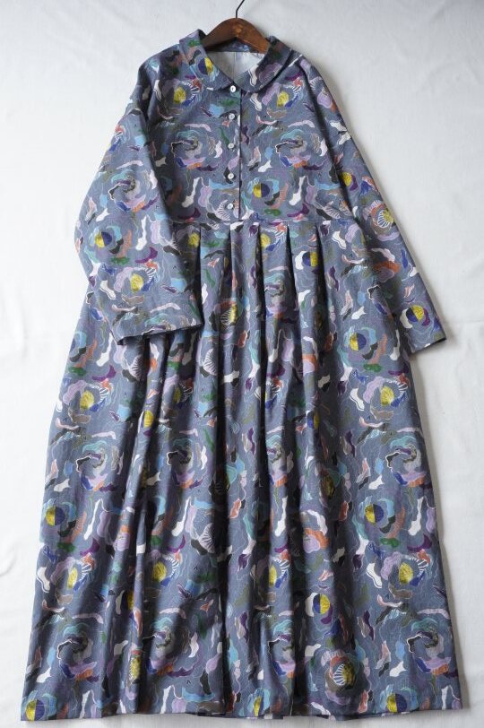 ハンドメイド♪「nora」さんcotton♪グレー色地に抽象画風柄♪襟付きOP