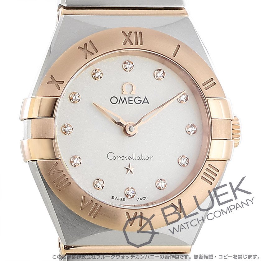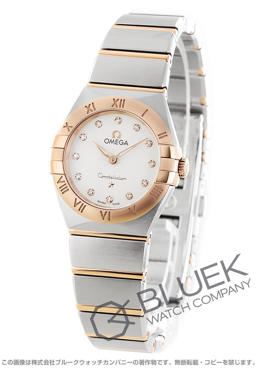 12粒のダイヤモンド煌めくシルバーダイヤルにローマ数字刻む18Kセドナゴールド製ベゼルとシルバー×18Kのコンビデザイン爽やかに引き立つコンステレーションは、小ぶりなサイズも女性らしい厚さ8ミリの25ミリケース&一体型ブレス使い勝手に優れるオメガ人気のタイムピース。12時のオメガマークや6時の星、スケルトン指針とダイヤモンド台座も18Kセドナゴールドで仕上げられて豪華です。中でも全体のツヤを抑えたブラッシュ仕上げにベゼル“4つの爪”の光沢が手元でキラリと光を反射させるこのモデルは、プッシュ式の両開きバックルも魅力。都会的で洗練されたコンビデザインが女性の手元を知的に彩ります。 |