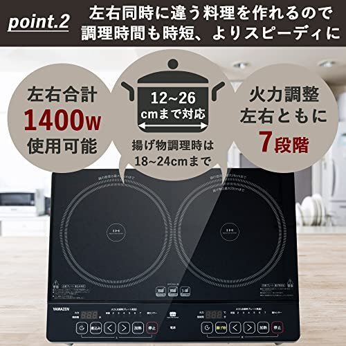 ブランド:山善(YAMAZEN)カラー:ブラック【届いたその日から使える】電源工事不要で簡単に接続できる据置型2口IHクッキングヒーター。「煮る」「焼く」「揚げる」など、どんな料理でもこれ1台でOK。火を使わないから、安心安全。【便利な脚付きタイプ】脚付きタイプなので、キッチンの調理台と高さが合わせられスムーズに調理できる。ヒーター台の下にスペースがあるのでフライパンなどの調理器具が収納可能。【調理に合わせてお好みを火加減を】とろ火から強火まで、作る料理に合わせて7段階での火力設定が可能。味が染み込みやすい「煮込みモード」も搭載。【見やすく、使い勝手がいい操作部】ボタンは大きく押しやすいので、どなたでも簡単に操作可能。操作・運転時の電子音はヒーター部裏面にあるスイッチで大小段階で調節可能。【かんたんお手入れ】フラットなガラストップなのでお手入れも簡単にできる。汚れてもサッと拭くだけですぐにキレイになるので、いつでも清潔に保てる。【商品詳細】対応鍋サイズ:12~26cm(揚げ物時は18~24cm)使える鍋(加熱調理):IH専用鍋、鉄ホーロー鍋、鉄鍋、鉄鋳物鍋、ステンレス鍋(ステンレスの素材によっては使用できない物もあります)使える鍋(揚げ物調理):鉄ホーロー鍋、鉄鋳物鍋、鉄鍋本体サイズ:幅56×奥行41×高さ18cm、本体重量:6kg電源コードの長さ:約2.3m電源:AC100V(50Hz/60Hz)、消費電量:1400W加熱:150W~1400W、揚げ物:140~200℃保証期間:お買い上げ日より1年間【電源工事不要で気軽に調理】電源工事不要ですぐに使える据置型IHクッキングヒーター。届いたその日から、おうちご飯が楽しめます。