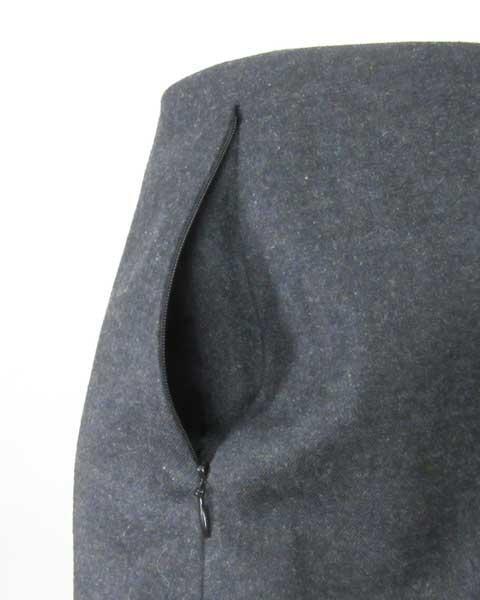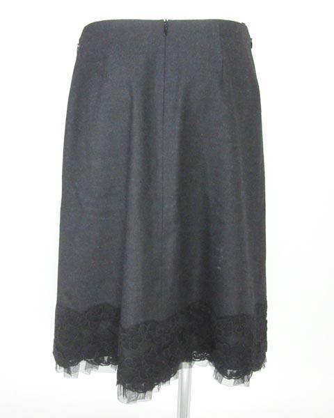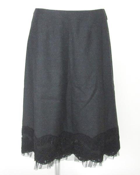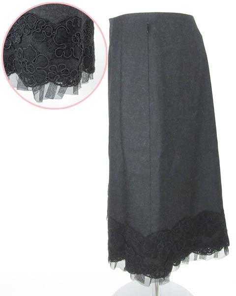 柔らかなウール生地のお上品なスカート。お裾部分のチュールとフラワーモチーフのデザインが華やかな印象です。シックなカラーなので色々と合わせる事ができますよ。バックファスナータイプ。両サイドにファスナーポケットがあります。 |