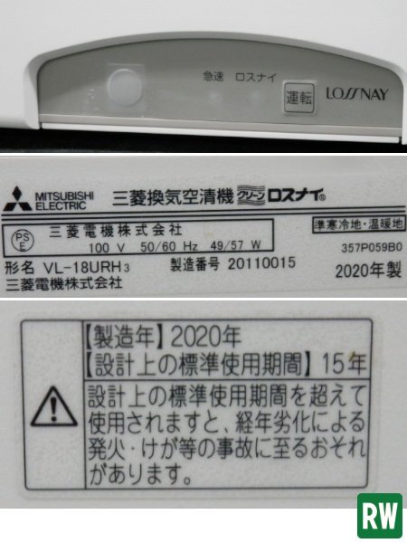 | 換気空清機 ロスナイ 三菱電機 VL-18URH3 100V 2020年製 LOSSNAY 換気扇 リモコン付属 |