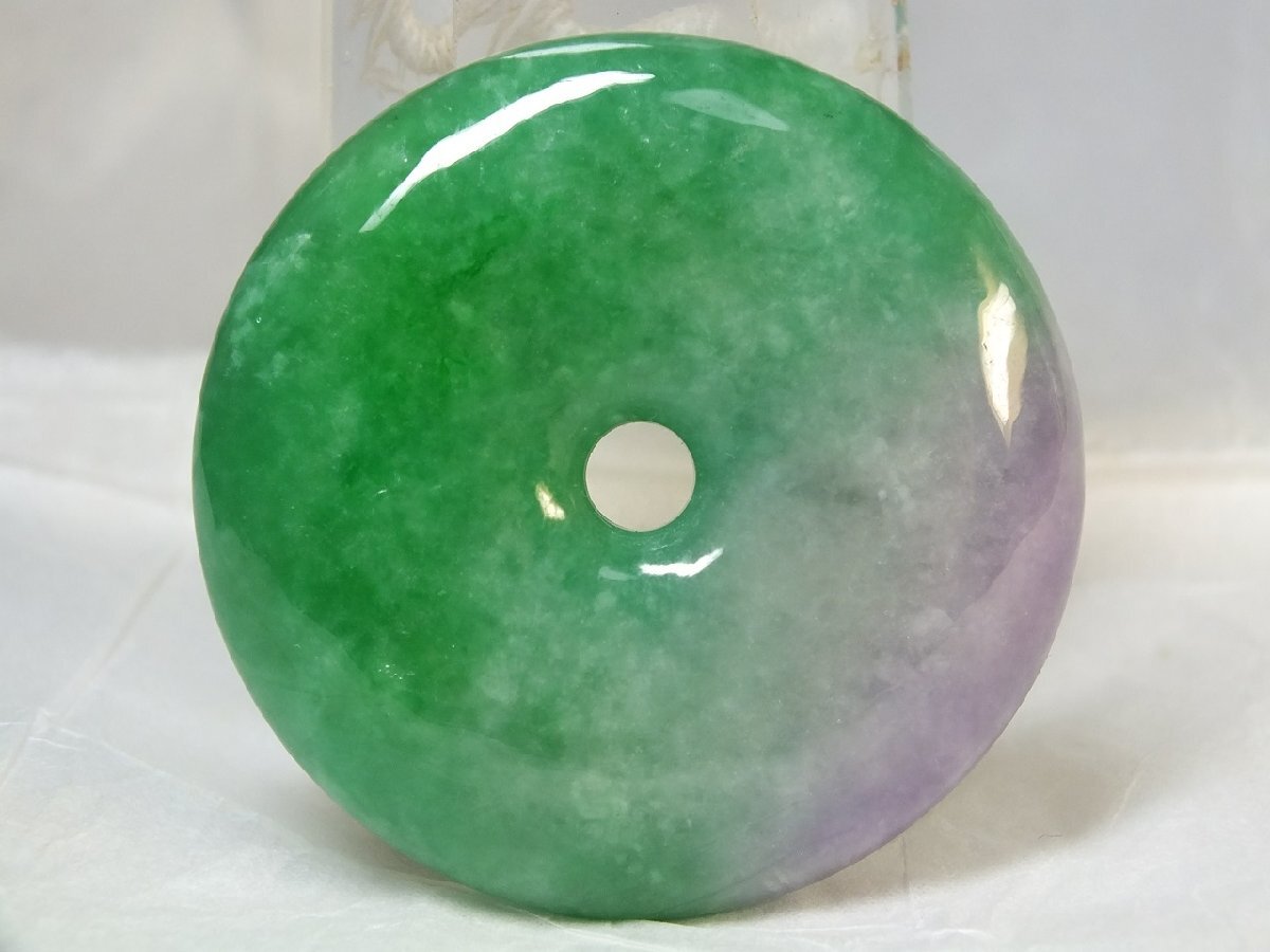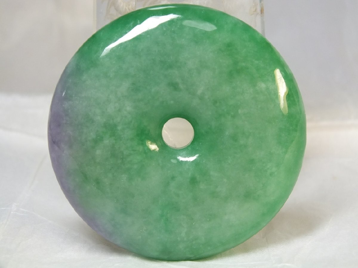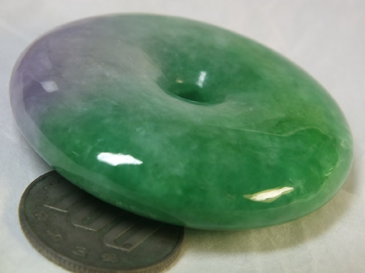▲商品説明▲ | サイズ:直径53×厚12mm 重さ:72.1g 緑色が綺麗なミャンマー翡翠。仄かにラベンダー色も混ざった珍品です。中央に直径約6mmの貫通穴が有ります。石コレクションやアクセ作り等に。 ☆商品につきましては注意を払った検品を行っておりますが、稀に石の表面にクラック状の筋や凹みが見受けられる場合が御座います。それは石本来の石紋で傷ではありません(割れが生じ易いヒビではありません)。返品の対象にはなりませんのでその旨御了承の上、ご検討下さい。 |