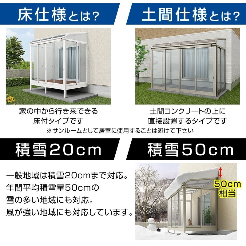 | 商品詳細 | この度は数ある商品の中から当商品を閲覧頂きまして有難う御座います。 商品定価 1,256,530円 ⇒ 販売価格 502,590円(送料・税込み) ●洗濯物干し場はもちろん、趣味の場所としてなど幅広くお使い頂けます。 ●室内との段差が少なく履物を履きかえることなく、出入りのしやすい設計。 ●窓サッシのクレセントレバー(鍵部分)が大きく、開閉の操作がしやすい。 ●最近の住宅サイズにマッチしやすい床高600mm設計。 ●床面は濡れても安心な塩ビ製デッキ。 特殊樹脂コーティング処理を施し劣化しにくく変色しにくい耐候性を有しています。 商品名:テラス囲いフラット屋根タイプ カラー:プラデッキ:アッシュグレー・マロンブラウン ※フローリング(ブラウン)は要加算 本体:ライトステン・ライトブラウン・ライトブラック・ライトホワイト(受注生産) 屋根材:ブルースモーク・ブラウンスモーク・クリアマット2 ※熱線遮断ポリカ(熱線ブルースモークマット・熱線クリアマット2)は要加算 サイズ:間口2.5間4550mm(柱芯々)=単体1.5間2760mm+連結1.0間1820mm× 出幅:4尺1170mm(壁面~前枠内側)×高さ:地面~前枠下まで2500mm ガラス5mm普通ガラス(透明)・型模様4mm板ガラス(受注生産)中桟無し ※組立説明書を事前にご希望の方はメールでの添付は可能(FAXは不可)です。 材質:アルミ形材 ポリカーボネート樹脂材 デッキ部分は塩ビ製デッキ材 仕様:ノーマルサッシ ランマ無し、プラデッキ仕様(デッキ厚30mm) 積雪:一般地域用(積雪20cmまで) 正面:掃出しサッシ4枚組(但し1.0間は2枚組) 側面:掃出しサッシ2枚組(但し3尺はFIX中桟有り/固定、9尺は4枚組) ※オプションにて、耐積雪50cm仕様や、熱線遮断ポリカーボネート仕様、網戸、 二重構造で強度が優れている「フローリング仕様」も御座います。 お気軽にお問い合わせ下さい。 ※備考:サンルームに比べると気密性は高くありませんので、強い雨風の際に、 室内へ雨水が浸入する場合もございます。ご注意下さい。 FIXガラスは現場組付となります。 妻FIXポリカはクリアマット2のみとなります。 出幅3尺は2枚掃出しサッシではなく、FIXになります。 出幅9尺は2枚掃出しサッシではなく、4枚掃出しサッシになります。 出幅7尺~9尺は、中間に大引きとツカが入ります。 また、出幅6尺・フローリング仕様の場合も同様です。 [使用上のご注意] 製品の破損などによる身体への重大な事故につながる恐れがありますので、以下の使い方を守ってください。 ◎下表の積雪量になる前に、必ず雪下ろしを行ってください。 新雪(しんせつ) 降り積もったばかりの雪 締雪(しまりゆき)積雪の重みで圧縮された雪 粗目雪(ざらめゆき)一度解けて再度凍って細かな氷の粒が集まった雪 1cmあたり約30N/m2(3kgf/m2) 雪比重:約0.3 1cmあたり約50N/m2(5kgf/m2) 雪比重:約0.5 1cmあたり約70N/m2(7kgf/m2) 雪比重:約0.7 雪下ろしの目安 標準タイプ20cm(600N/m2) 新雪20cm 締雪12cm 粗目雪8cm 積雪タイプ50cm(1500N/m2) 新雪50cm 締雪30cm 粗目雪21cm (注)数値はおよその目安です。 本文積雪量は1cmあたり30N/m2(比重0.3)の単位量にて算出しています。 湿った雪の場合、lcm当たりの重さがさらに大きくなる場合がありますので、早めに雪下ろしを行ってください。 ●床に制限荷重1,800N/m2(183kgf/m2)以上の荷重をかけないでください。 商品が破損するおそれがあります。 ●天気の良い日や夏場は室温が上昇しますので、充分換気してください。 ●屋根に乗ったり、または柱に登ったり、ぶら下がったりしないでください。 ●屋根には重量物を乗せたり、温水器、ソーラーパネルなどを設置しないでください。 ●サンル-ムとして居室に使用することは避けてください。 ●商品に電線を巻き付けないでください。漏電により感電する恐れがあります。 除草剤及び殺虫剤などの化学薬品が付着しますと、 変色及び腐食の恐れがありますので、洗い流してください。 ●木製家具等を長期間置くと、色あせ、そりが生じることがありますのでご注意くださ い。 ●使用状態により結露が発生し、屋根から落ちてくる場合がありますので、カ-ペット等 の使用及び洗濯物等の取扱いの際はご注意ください。 ●直射日光が当たると床材が退色する恐れがありますのでご注意ください。 ●プラデッキ、フローリングの上で、シンナー、べンジン、灯油等の溶剤類は使用 しないでください。近くでの火気の使用は避けてください。 ●表面がぬれている時は、すべりやすくなりますので注意してください。 ●物干し竿にぶらさがらないでください。物干し竿を必ず使用し、ロープ等をかけて使用 しないでください。 [設計・施工上のご注意] ●弊社の工クステリア商品は、社内基準に準拠しており、安全にご使用いただけるように 設計されています。 その設置場所や地域・用途により法規や条例などの制限を受ける場合がありますので 設置する場合には、その地域の所轄窓口にご確認ください。 ●商品の施工については必ず取付説明書に従ってください。また、施工完了後に取扱説 明書を施主様にお
