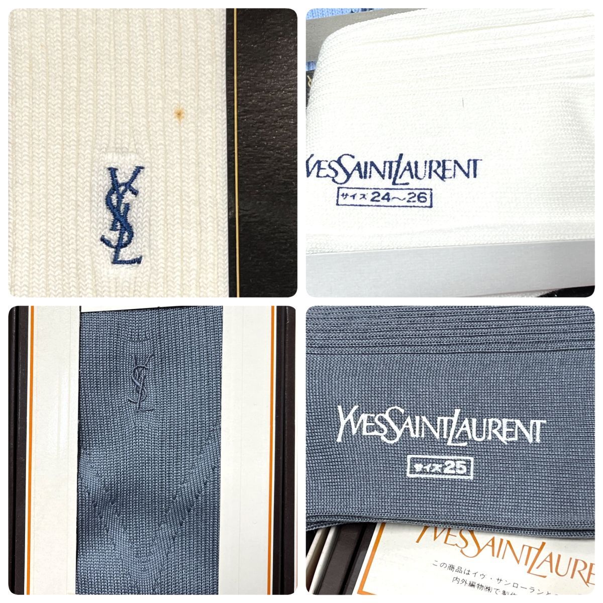 ------■商品詳細----------------------------------------- 個人宅での未使用の保管品になります。 保管による多少の小傷や薄汚れはあるものとお考え下さい。 靴下はほぼ綺麗ですが、小さなシミ汚れのあるものもあります。 箱には傷や汚れが見られます。 写真にてご確認ください。 靴下は38足で、ハンカチとセットになっているものもあります。 全てまとめてのお渡しとなります。 <★サイズ★> YSLの3足のみ24〜26cm その他25cm <★付属品★> 写真に載っているものになります。 [商品状態説明] 【1】完動品 【2】簡易確認では問題は無く、長時間および細かな点までは確認していない 【3】通電または電源のみの確認 【4】動作未確認 こちらの動作状態は【】になります。 [商品ランク説明] 【N】新品・未開封 【S】使用はしていないが、開封済み 【A】使用回数が少なく、比較的に綺麗な状態 【B】通常使用程度の使用感がある状態 【C】使用感など小傷や汚れの多い状態 こちらの外観ランクは【S】になります。 ※傷や汚れ、外観などにつきましては、 ご入札前に十分に画像にて状態確認をお願い致します。 -岐阜県発 元払いのみ- クロネコヤマト 料金表 【120サイズ】〜15kg 北海道【北海道】2,520円 北東北【青森 秋田 岩手】 2,110円 南東北【宮城 山形 福島】 1,970円 関東【茨城 栃木 群馬 埼玉 千葉 東京 神奈川 山梨】 1,850円 信越【長野 新潟】 1,850円 北陸【石川 富山 福井】 1,850円 中部 【静岡 愛知 岐阜 三重】 1,850円 関西【京都 滋賀 奈良 和歌山 大阪 兵庫】 1,850円 中国【岡山 広島 山口 鳥取 島根】 1,970円 四国【香川 徳島 高知 愛媛】 1,970円 九州【福岡 佐賀 長崎 熊本 大分 宮崎 鹿児島】 2,110円 沖縄 3,360円 ------■支払詳細----------------------------------------- ◇Yahooかんたん決済 ------■発送詳細----------------------------------------- 多くの方とお取引をさせて頂いております。 お品物は水曜日を除き、 入金確認後1-2日以内に発送させていただきます。 また同梱は同日終了分のみとさせていただきますので、 予めご理解をお願いいたします。 壊れ物、貴重品、大型品等、一部同梱ができない物もございます。 予めご了承ください。 手渡しをご希望の方は落札後にご連絡下さい。落札後1週間以上かかる場合は質問にてご相談下さい。手渡しは水曜日以外でしたら9:00~17:00で受付しております。 ------■注意事項----------------------------------------- 仕事の都合上、ご連絡は水曜日以外の10〜18時までのお返事となります。 お支払方法、発送方法の変更はお受けできません。 ご落札後、48時間以内にご連絡が確認できない場合、 落札をキャンセルさせていただきますので、予めご了承ください。 | ||