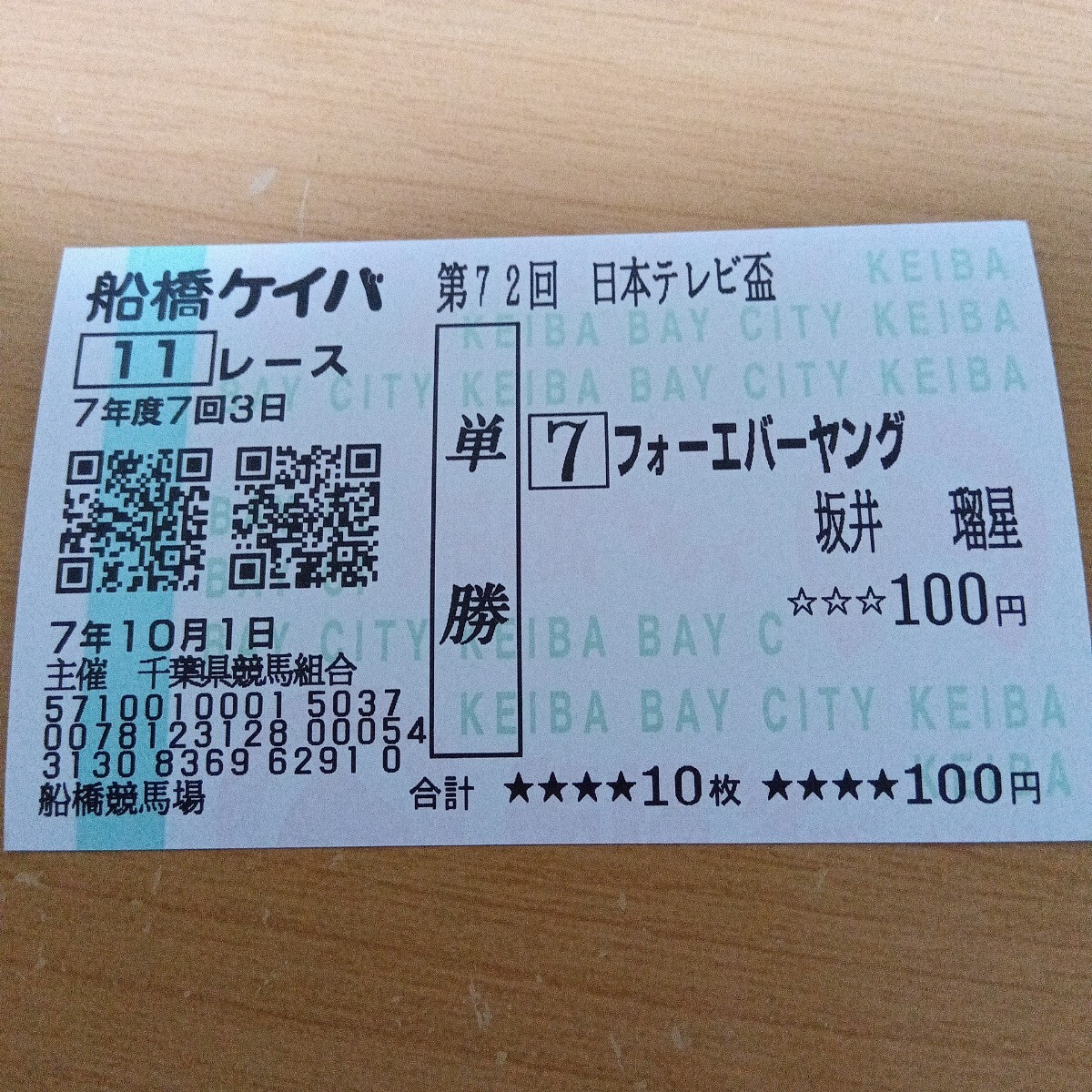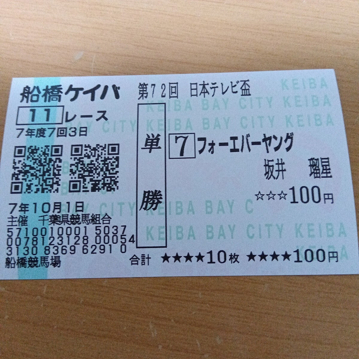 船橋競馬場 現地的中 日本テレビ盃 単勝馬券 フォーエバーヤング 坂井瑠星騎手 カードコレクション 未使用 船橋ケイバ ウマ娘