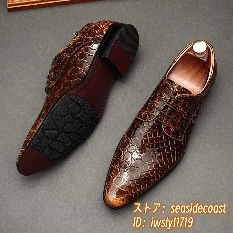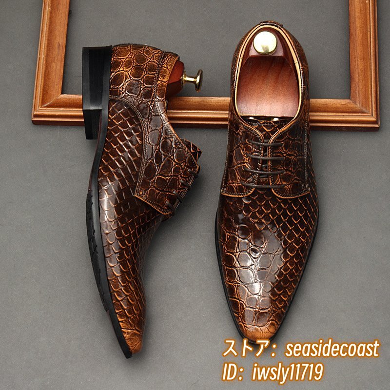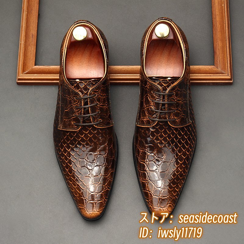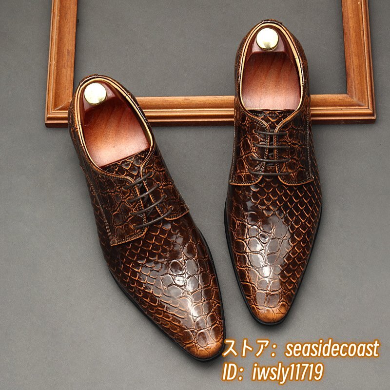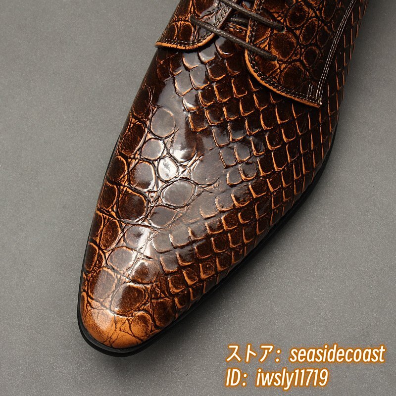 定価10万超★最高級 メンズ ビジネスシューズ 鰐柄 本革 レザーシューズ 牛革 イギリス風 職人手作り 紳士靴 革靴 結婚式 ブラウン 25.0cm