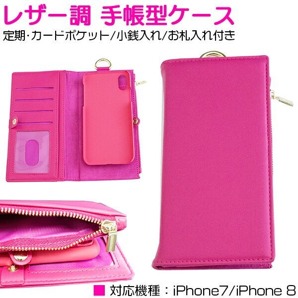 iPhone7/8用 iPhone7ケース iPhone8ケース 財布付き 手帳型ケース カード入れ カードケース 4ポケット レザー調 ピンク