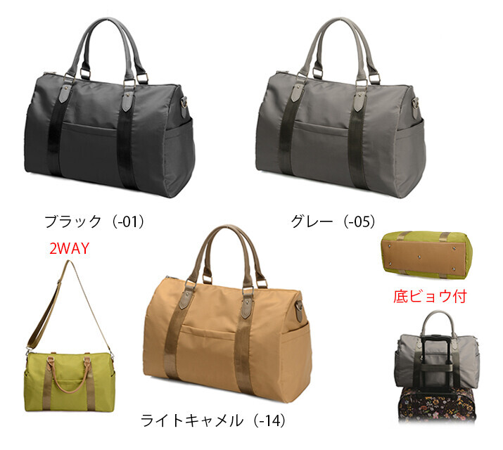 落ち着いたカラーが魅力の大容量キャリーオンが可能な2WAYボストンバッグです。7ポケット付きで荷物が多くても安心。さらに背面にはキャリーオンベルトが付いているのでキャリーケースの持ち手に通して移動もらくらく♪底鋲付きで汚れにくく、取り外しできるショルダーストラップ付きで、シーンや用途に合わせて持ち方を変えられるうれしい2WAY仕様。季節や服装を選ばない落ち着いたベーシックカラーは魅力的。旅行や出張、ジムやレジャーにも大活躍。2泊3日の旅行にも最適。