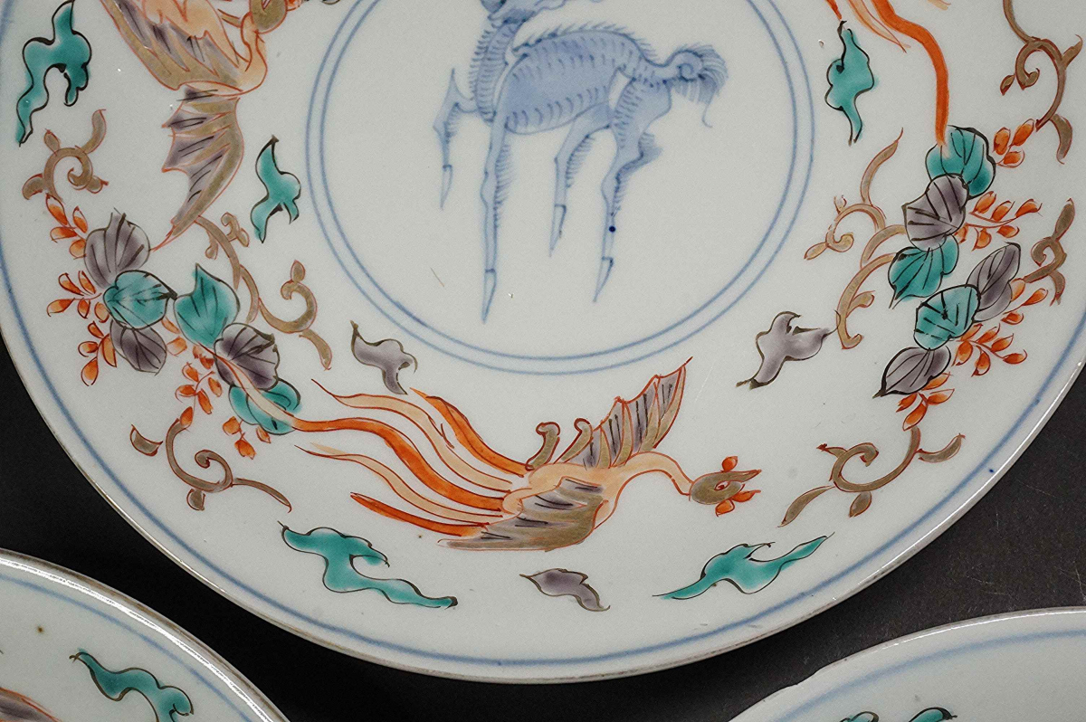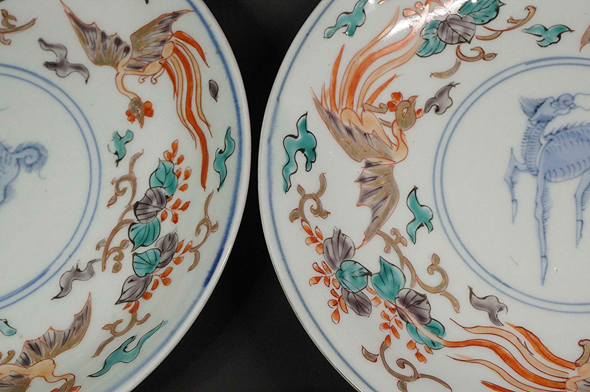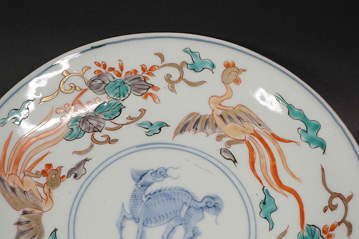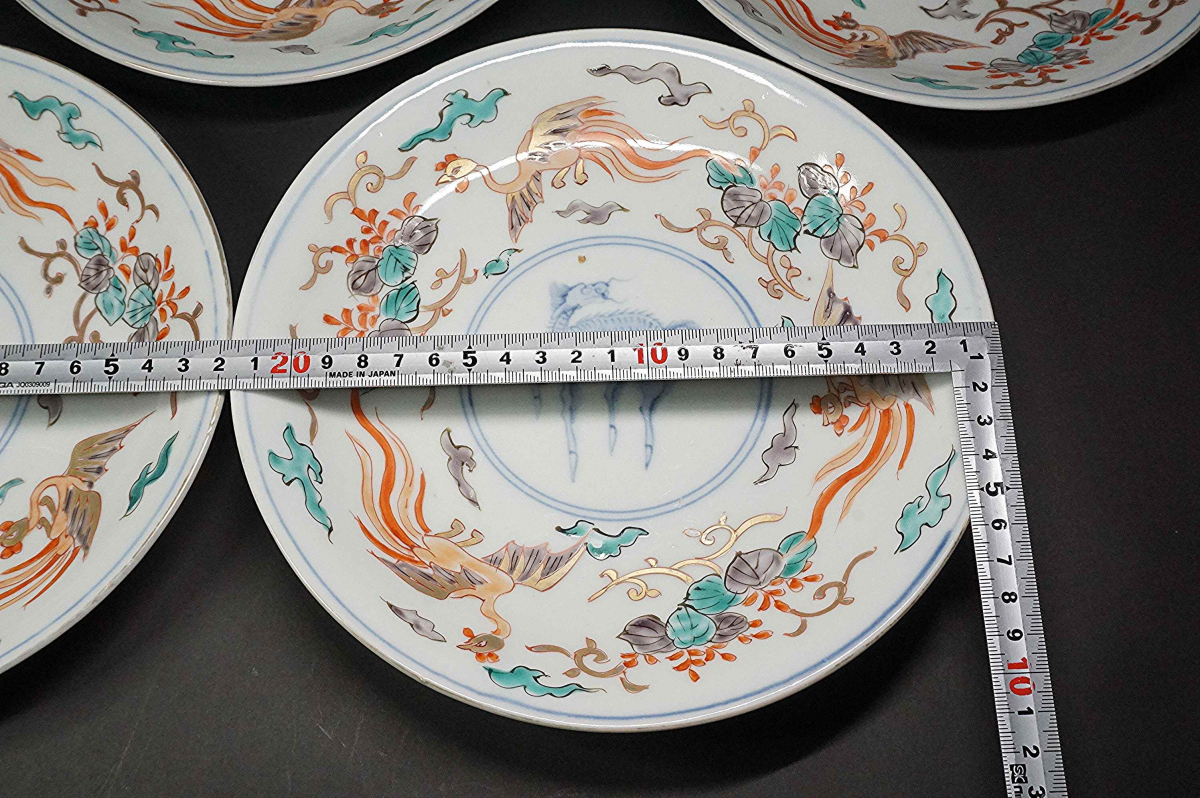 商品説明 | お洒落な古伊万里の鳳凰桐文7寸皿5枚です。状態は割れ欠けなく無傷で色絵の保存状態も良好です。寸法は口径約21.8cm、高さ約3.4cm。 |