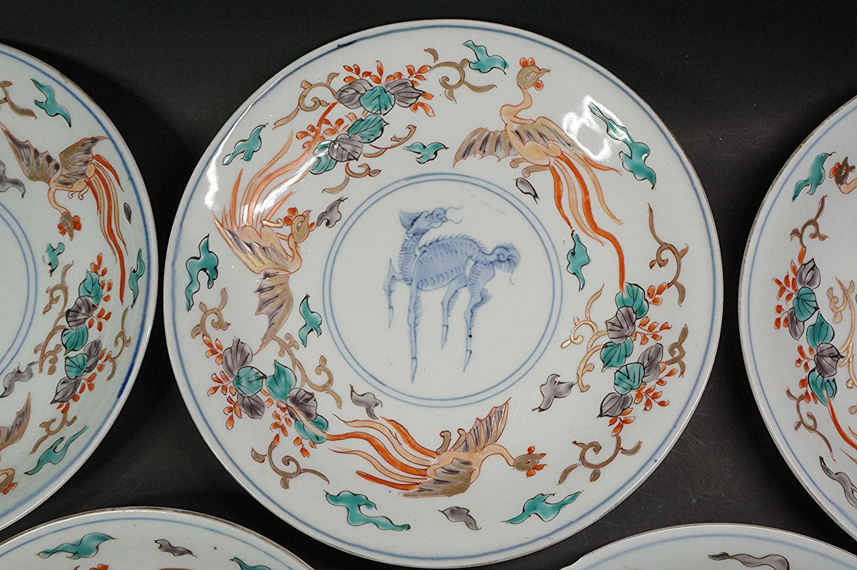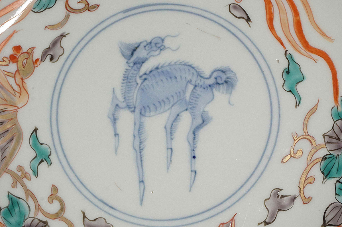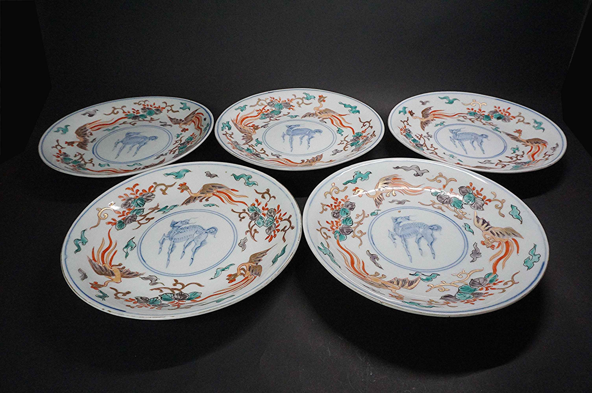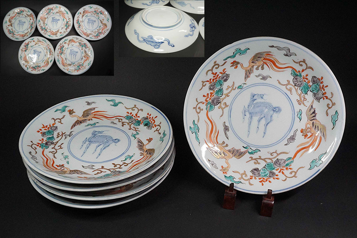 商品説明 | お洒落な古伊万里の鳳凰桐文7寸皿5枚です。状態は割れ欠けなく無傷で色絵の保存状態も良好です。寸法は口径約21.8cm、高さ約3.4cm。 |