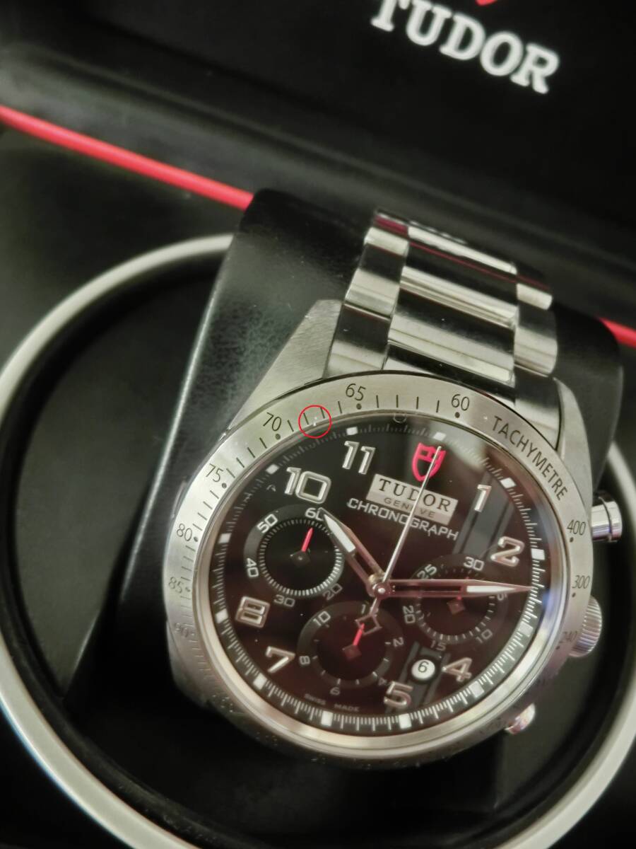 ☆ベゼルの53分の位置に小さな打痕があります。ほかにも光にかざさないと見えない程度の小傷が少しあります。※写真10枚目