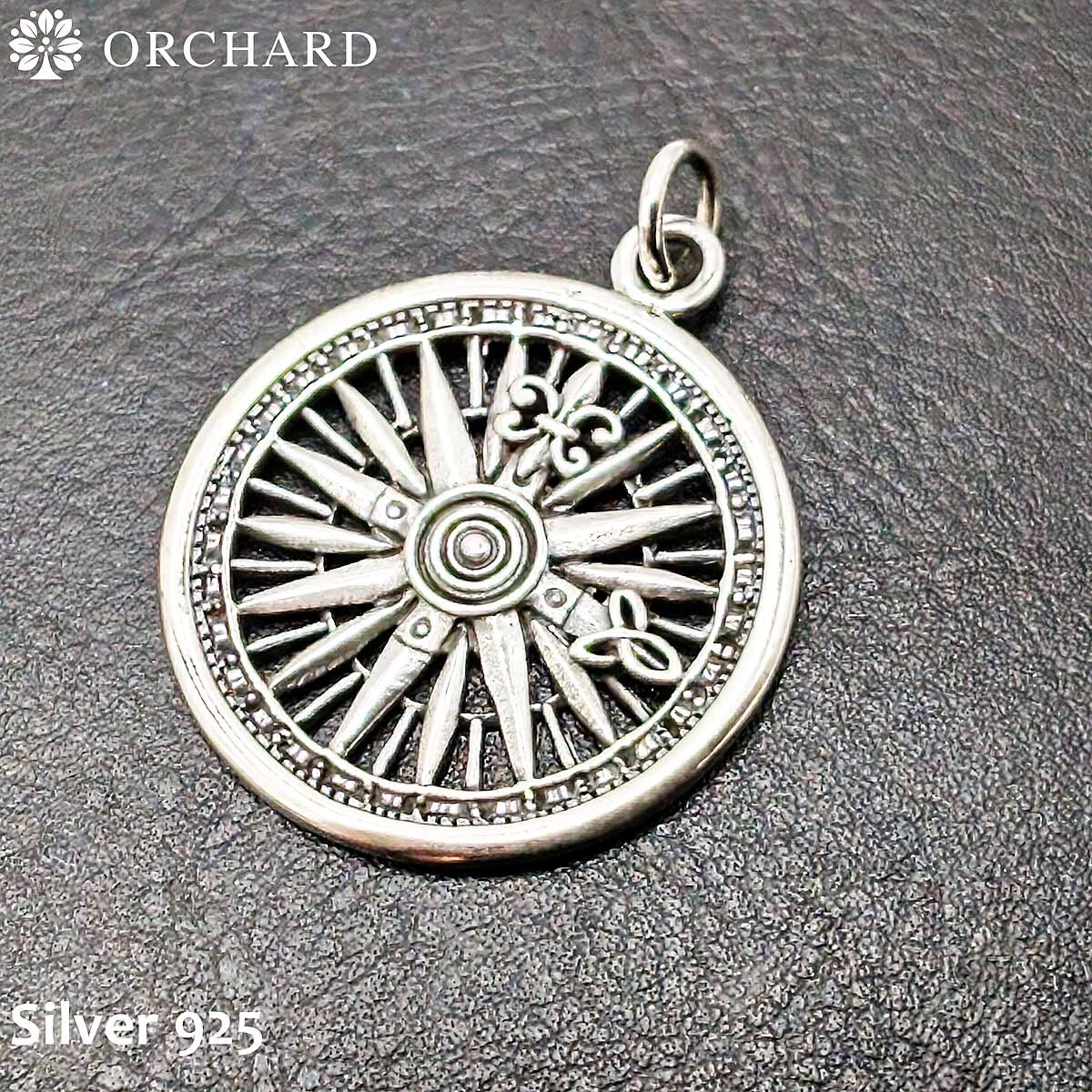 シルバー925製のコンパスデザインの真円ペンダントトップです。細部にまでこだわったデザインで、シンプルながらも存在感のある仕上がりになっています。シルバーの輝きが美しく、カジュアルな装いからフォーマルなシーンまで幅広くお使いいただけるアイテムです。どんなスタイルにも合わせやすいシンプルなデザインで、胸元にアクセントを加えてくれます。