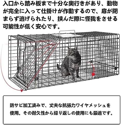 【逃げられる可能性が限りなく低い】入口から踏み板まで十分な奥行きがあり、動物が完全に入って仕掛けが作動するので、扉の開閉速度や編み目の大きさなど、小動物が傷つかないよう安全に配慮して作られているため、安心して使えます。防サビ加工済みで、丈夫な抗張力ワイヤメッシュを使用しています。耐久性が抜群で繰り返しの使用も可能です。