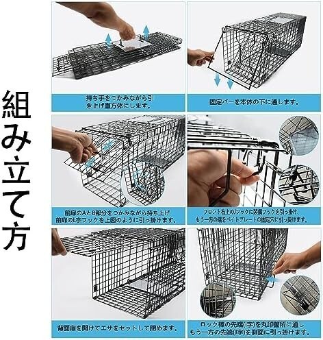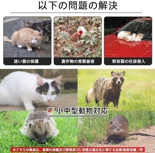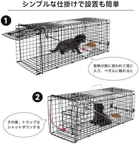 【シンプルな仕掛けで設置も簡単】 動物愛護法や鳥獣の保護及び管理並びに狩猟の適正化に関する法律 (鳥獣保護の狩猟に関する法律)に準じてお使い下さい。捕獲器の後ろの方へ餌を置き、板を踏みやすく工夫することで、しっかりと猫を閉じ込めることができます。捕まえたい小動物のサイズに合わせて捕獲器のサイズを選びしてください。