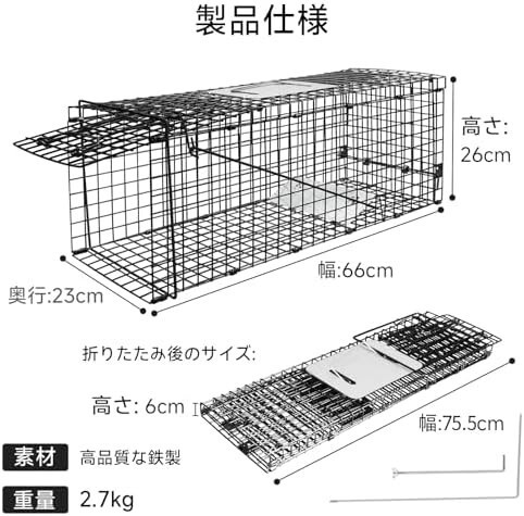 • 【農作物の害獣対策にもオススメ】 サイズ :66×26×23cm 農作物の害獣被害にお悩みの方にもオススメです。タヌキ、イタチ、テンなどの動物が捕獲可能です。大切に育てた農産物や植物をタヌキなどの動物から守り、被害を控えることはこの商品の役に立ちます。持ち運びもしやすく畑などに簡単に設置できます。