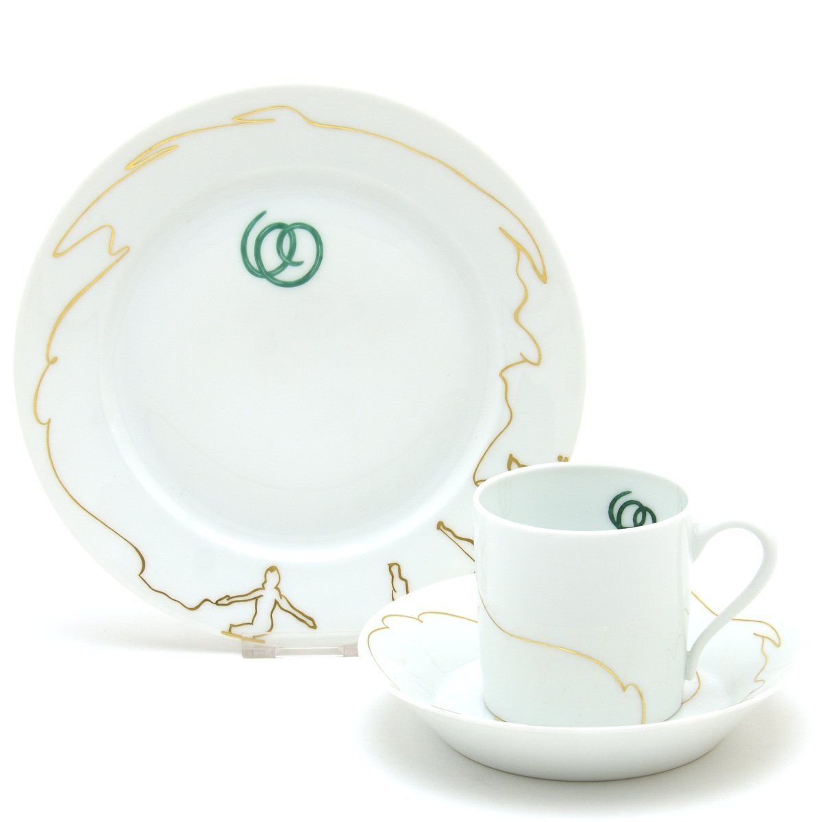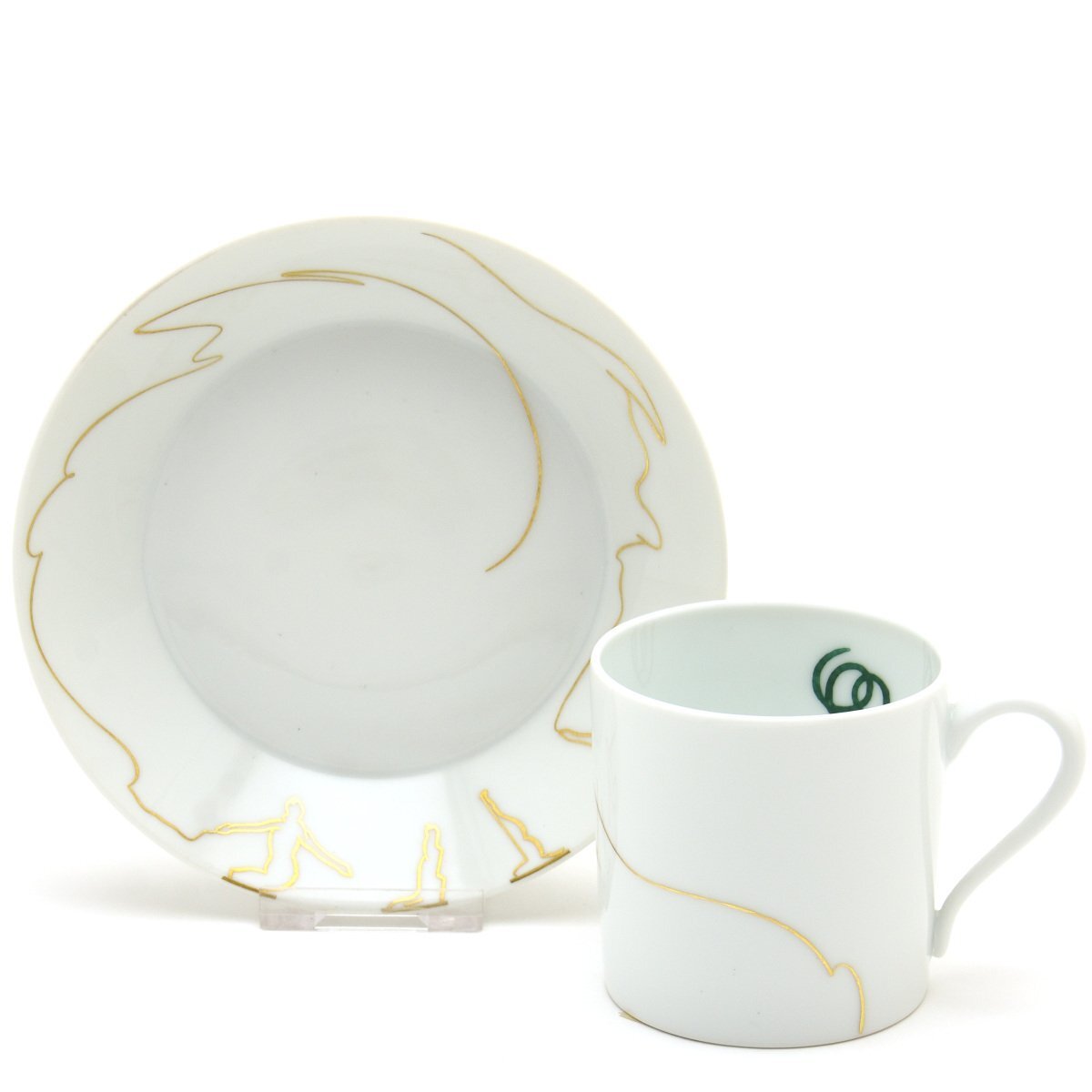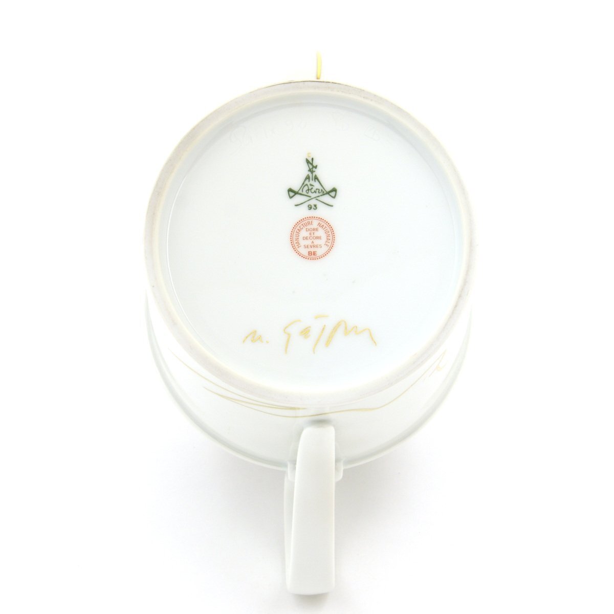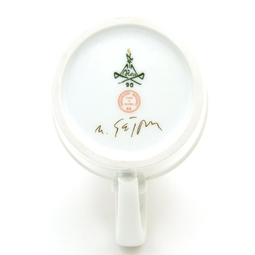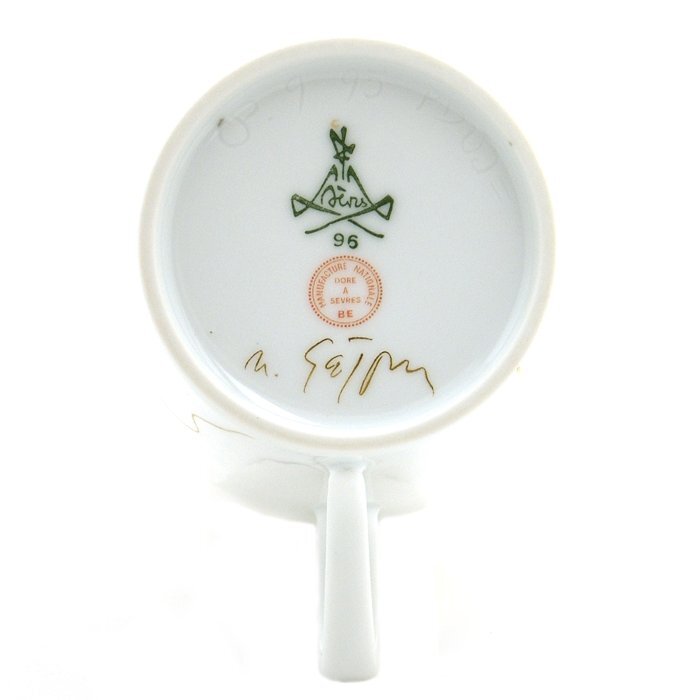 クリエーター:Natacha Pecheff(ナタシャ ペシェッフ) フランス国立セーブル陶磁器製作所工房で創作活動をする装飾作家(画家)、陶芸家。 【素材:PD(ハードペースト)1770年頃にセーブル工房で開発調合された素材】 現代ではポピュラーなこの碗皿リトロンのフォームは18世紀セーブル陶磁器製作所で創作されました。もとは液体を測定するリットル瓶の形から、カップの形に変換したものです。これは初期セーブル陶磁器製作所の天才的ひらめきの一つとなり、以後間をおかずヨーロッパ各地の陶磁器製作所で類似品がコピー制作されました。 作品にはセーブル工房のロゴと成型年度、装飾完成年度と作家のサインが記されていると共にデザインを手がけたWolfgang Gafgen(ウォルフガング ガフゲン)のサインが記されています。 セーブル作品はハンドメイドで制作されているため為一点一点装飾の細部など微妙に異なります。 カップ、受け皿ともに轆轤成型によるもので、取っ手は型に流し込んで成型し、十八世紀当時の技法による液状陶磁器で手作業で取り付けられています。最初に980度の温度で焼かれた後、無色の釉薬の中に素早く浸して、釉がかけられます。乾燥後に筆による修正を施した作品は1380度の高温で焼かれます。作品の内外面の縁の部分や人物の影の部分などに帯状装飾が施されその装飾は24カラット金が使われ、緑色部分はプチ・フー(金や色彩を低温で焼き付ける)技法でハンドペインティングのぼかし彩色がされこの作品に合致した作風となっています。 ☆Pate dure(porcelaine dure ou P.D)☆ ハードペースト(硬質磁器P.D):基本素材はカオリン(70%を含む)、長石、水晶、凍石からなる本磁器。これらの素材を約1300℃~1450℃で高温焼成する。 |