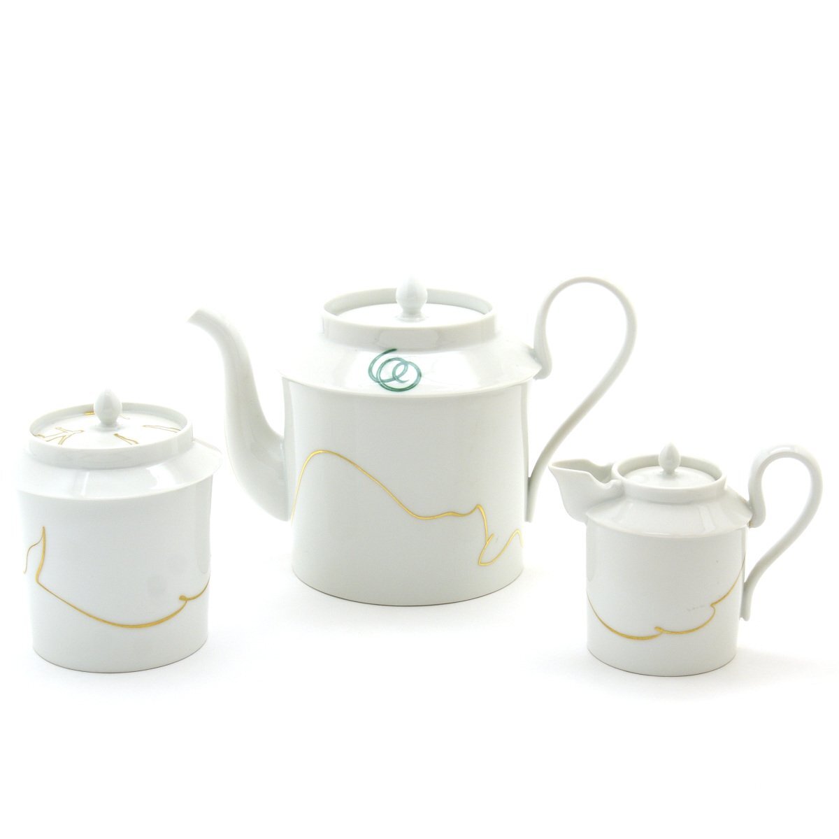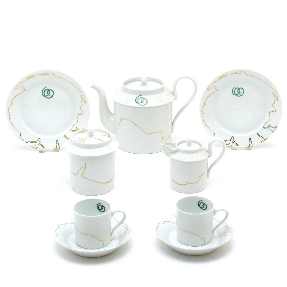 作品サイズ | {カップ(140cc) (口径:6.5cm,高さ:6.1cm,持ち手を含む長さ:8.6cm) x2} {ソーサー(直径:13cm,高さ:2.6cm) x2} {プレート(直径:17.3cm,高さ:1.6cm) x2} {コーヒーポット(1.2L) (持ち手を含む長さ:22.5cm,直径:13.5cm,高さ:15.5cm) x1} {クリームジャグ(220cc) (持ち手を含む長さ:12.2cm,直径:7.6cm,高さ:10cm) x1} {シュガーポット(380cc)(高さ:12.3cm,直径:10.2cm) x1} | ||