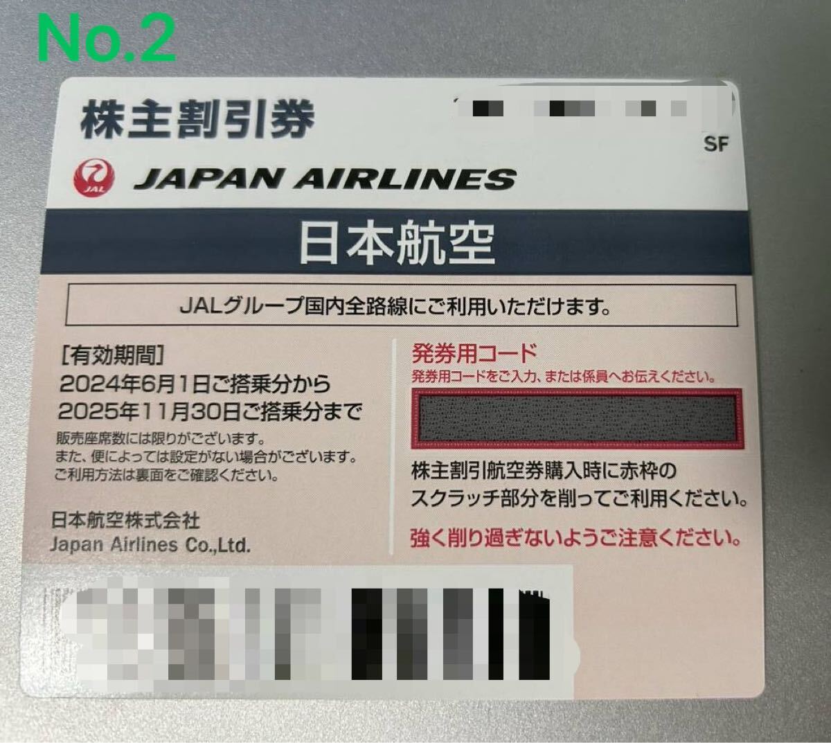 JAL(日本航空)の株主優待券です。 個数:1枚 有効期限:2025年11月30日