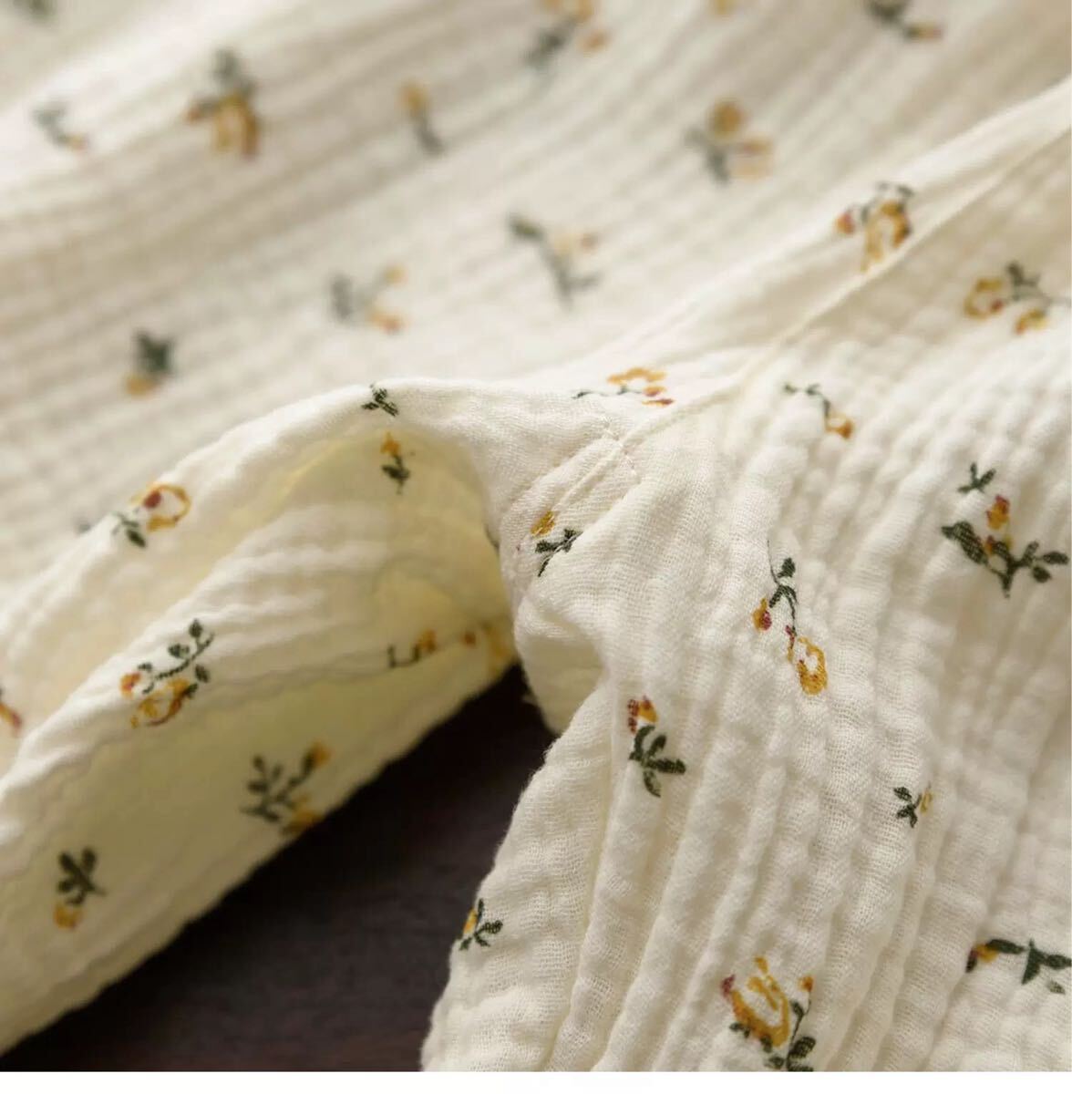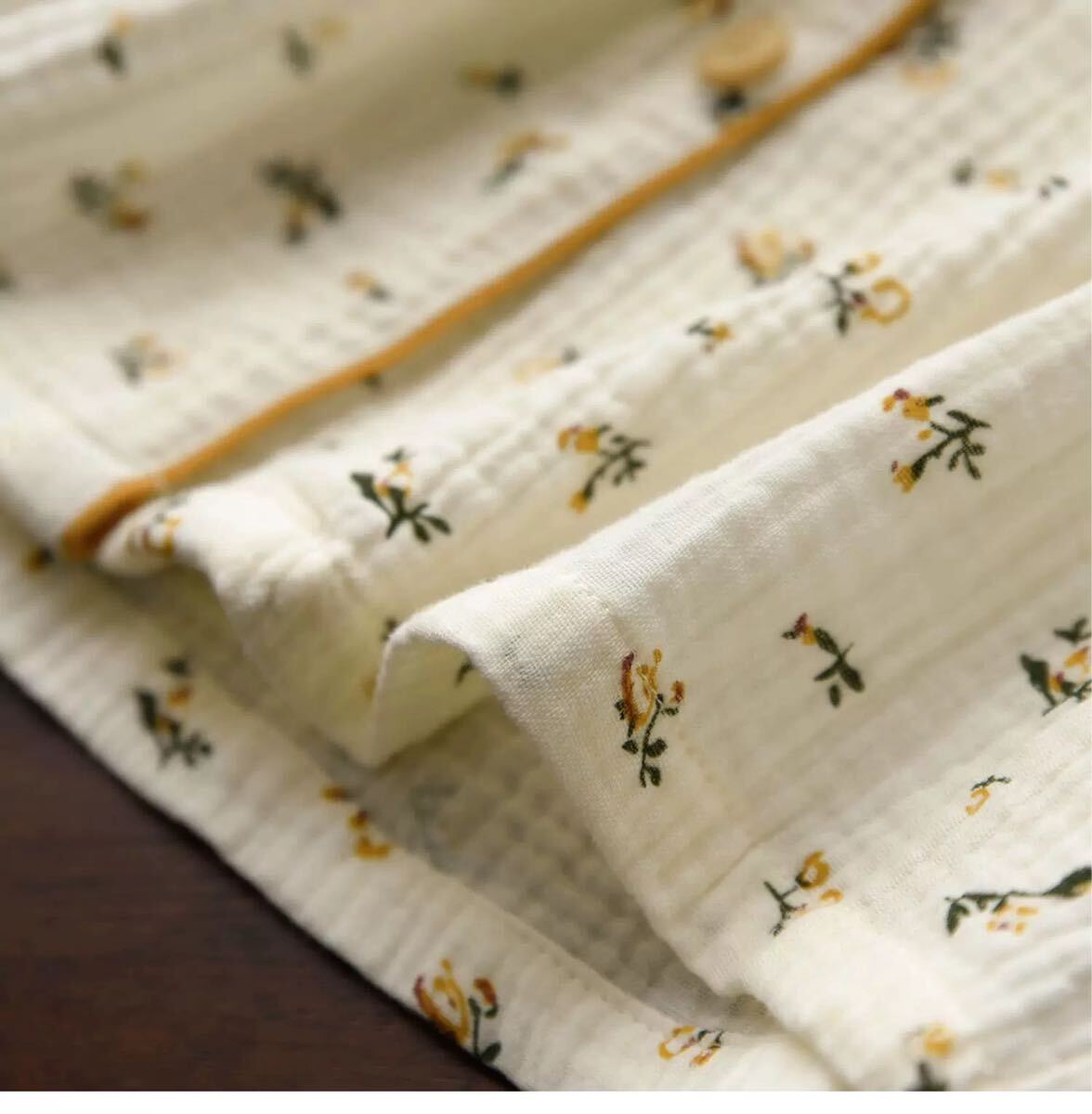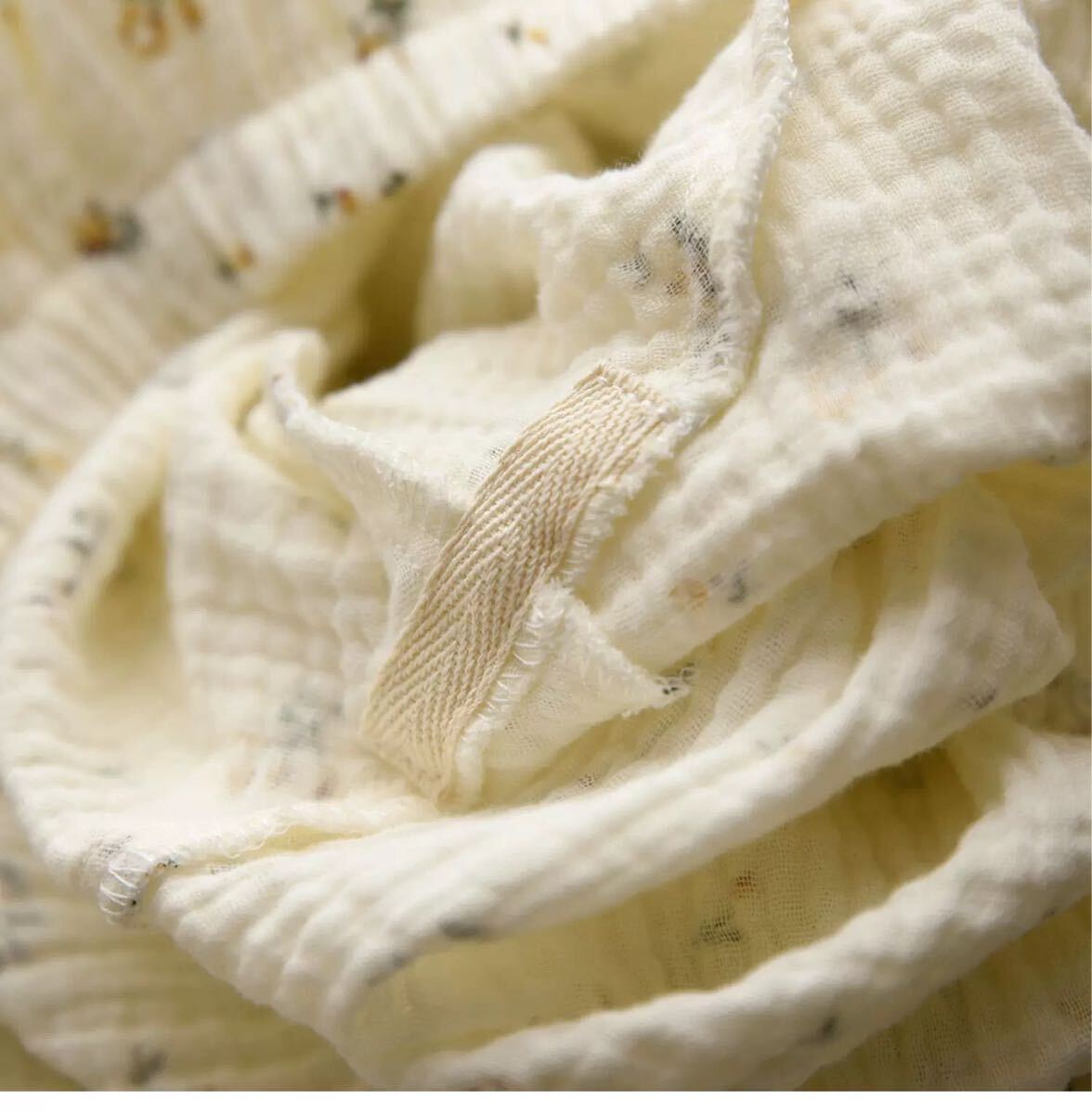 【ダブルガーゼ】薄い綿のガーゼを2枚合わせにした生地のことをいいます。生地と生地の間に空気の層ができることにより、保温性もあり寝冷え対策に適した素材です。
