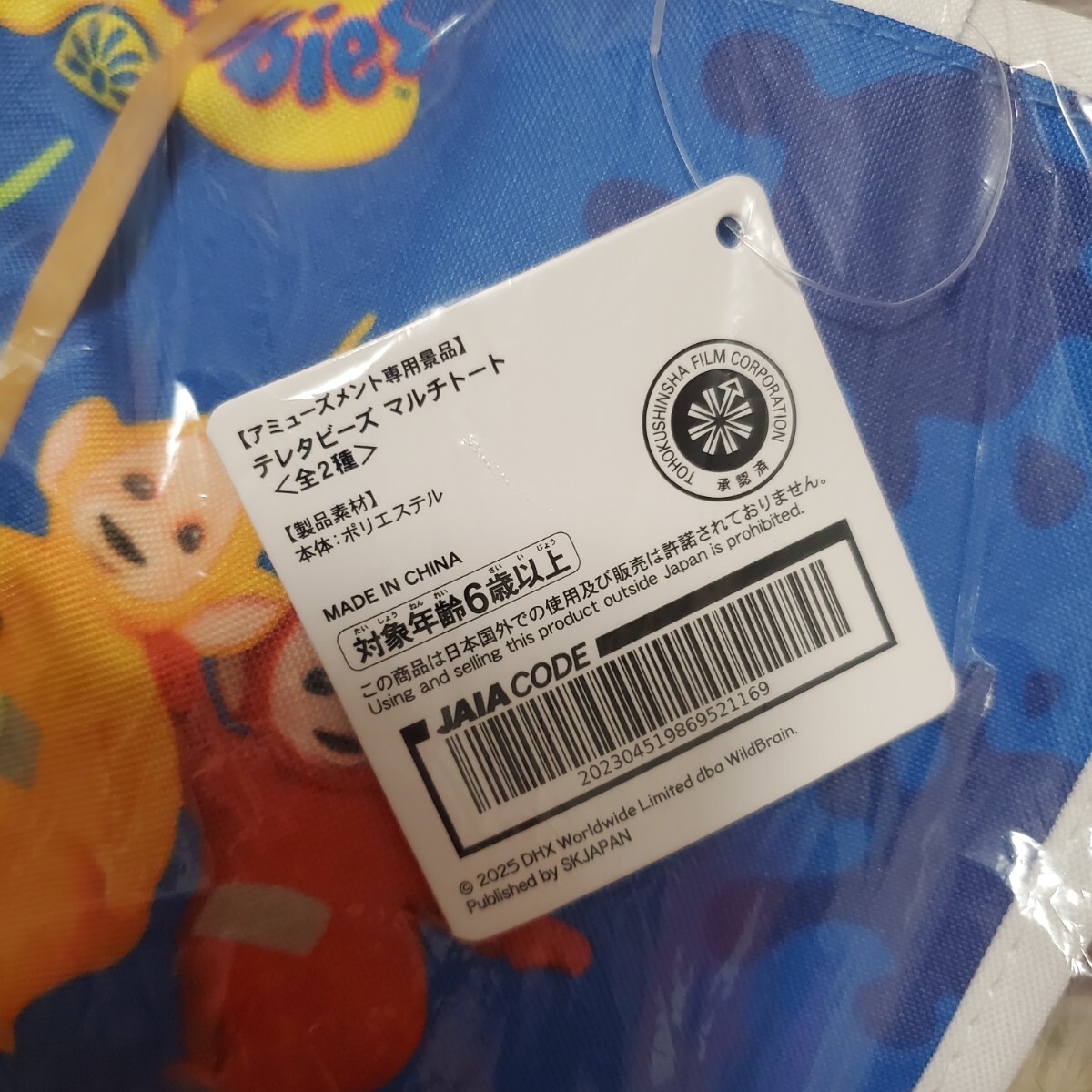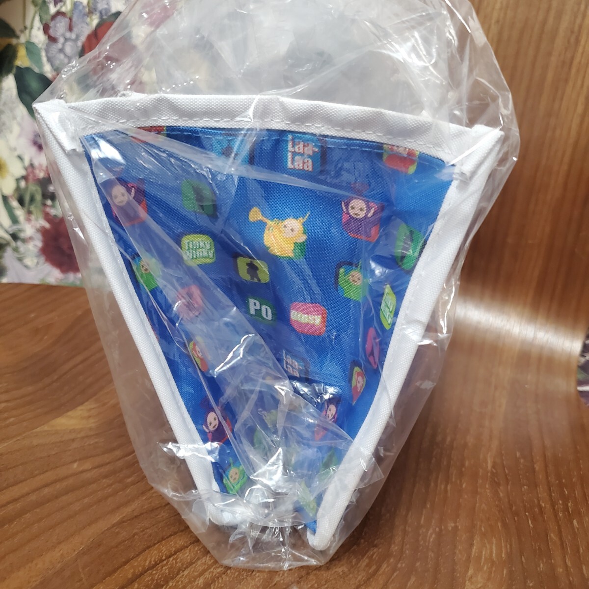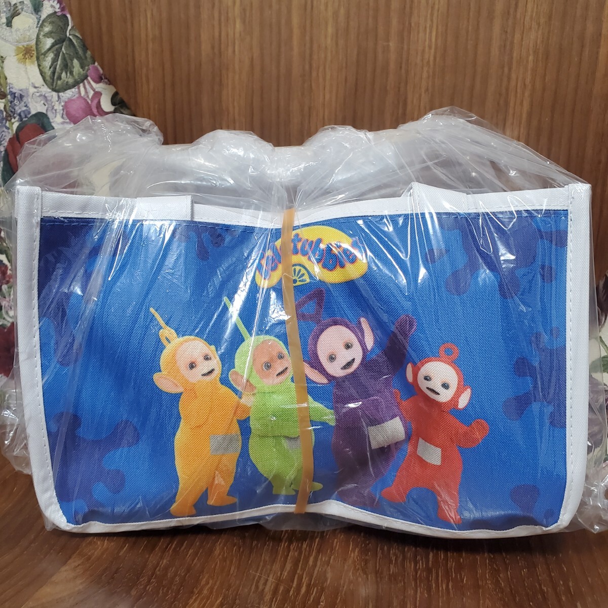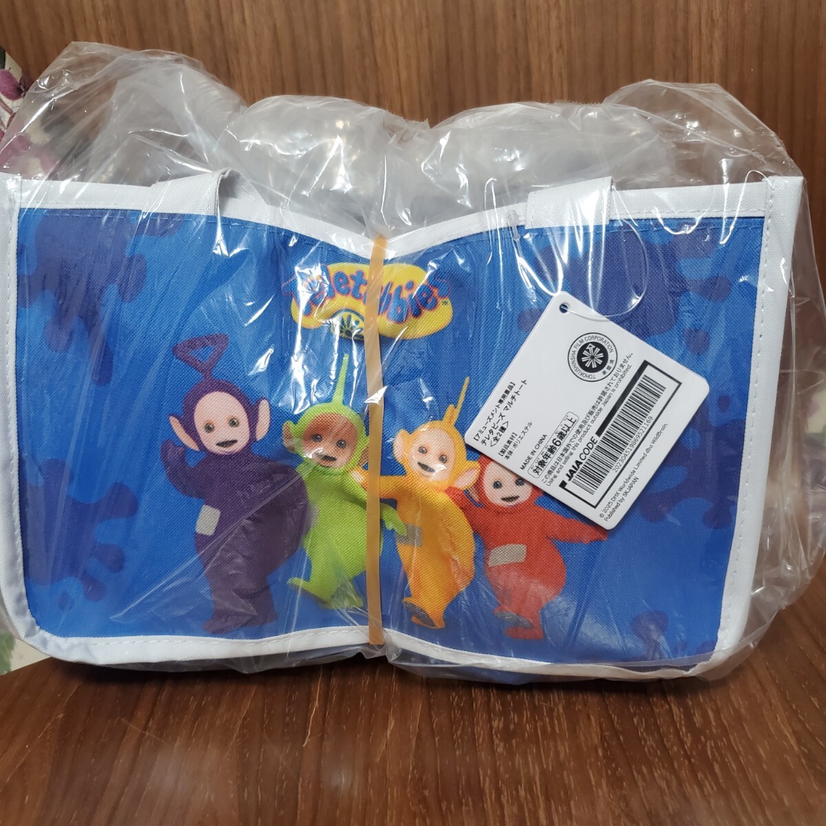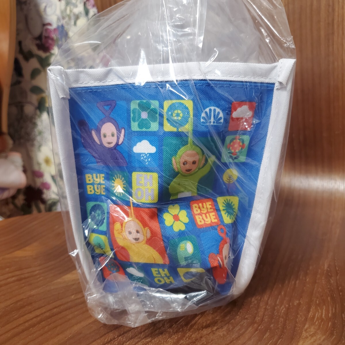 テレタビーズのキャラクターがデザインされた、内部にポケット付きのバッグ。