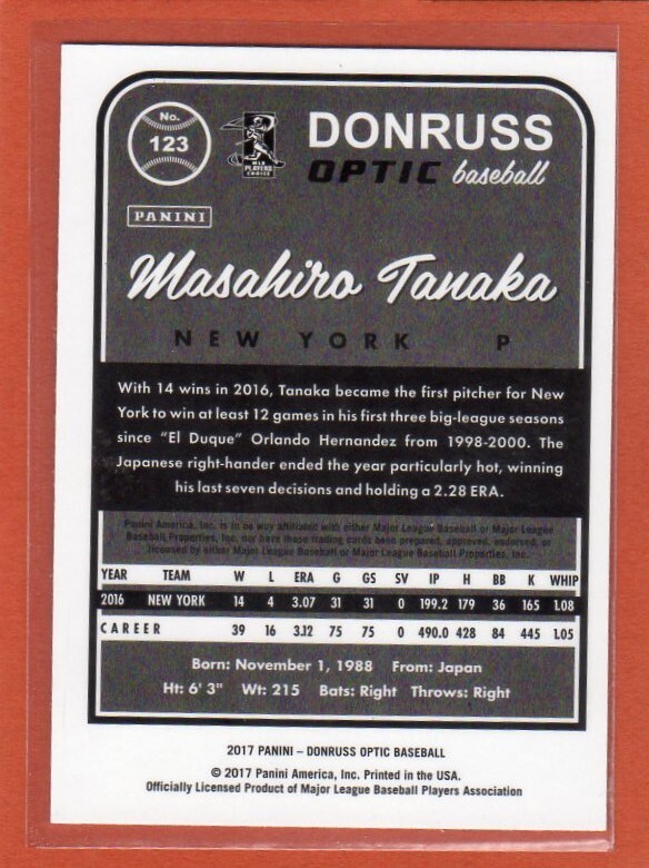 2017PANINI DONRUSS OPTIC BASEBALL #123 田中将大ファンの方、是非どうぞ! |