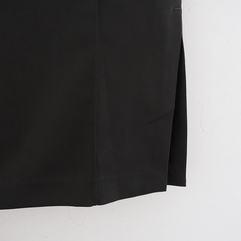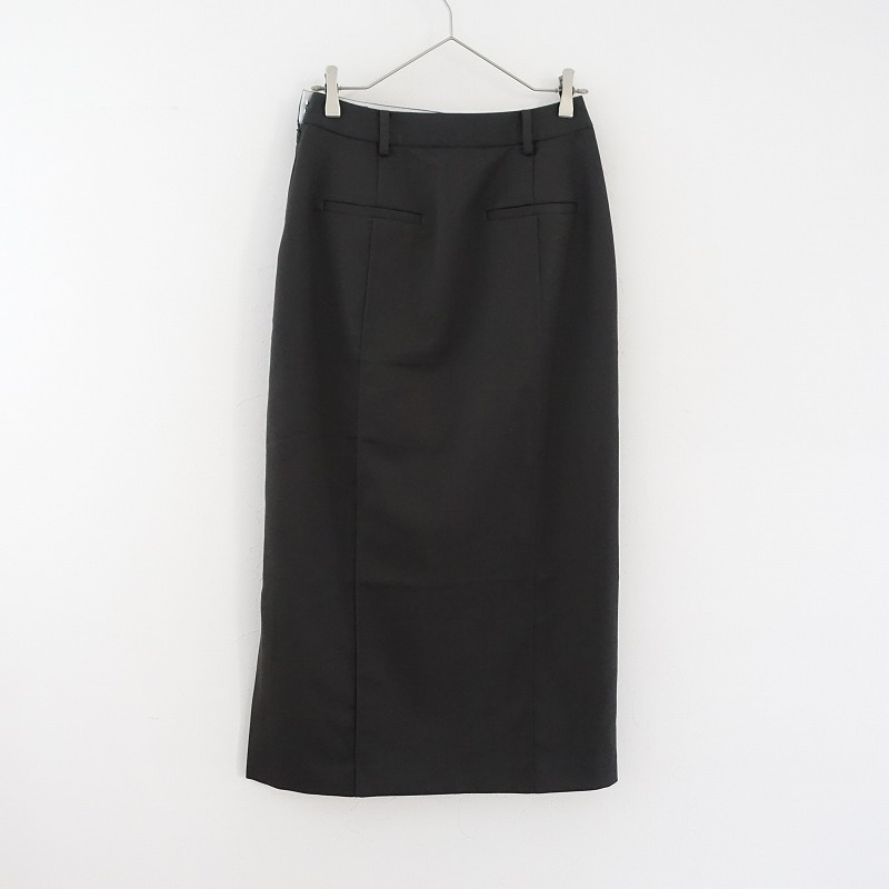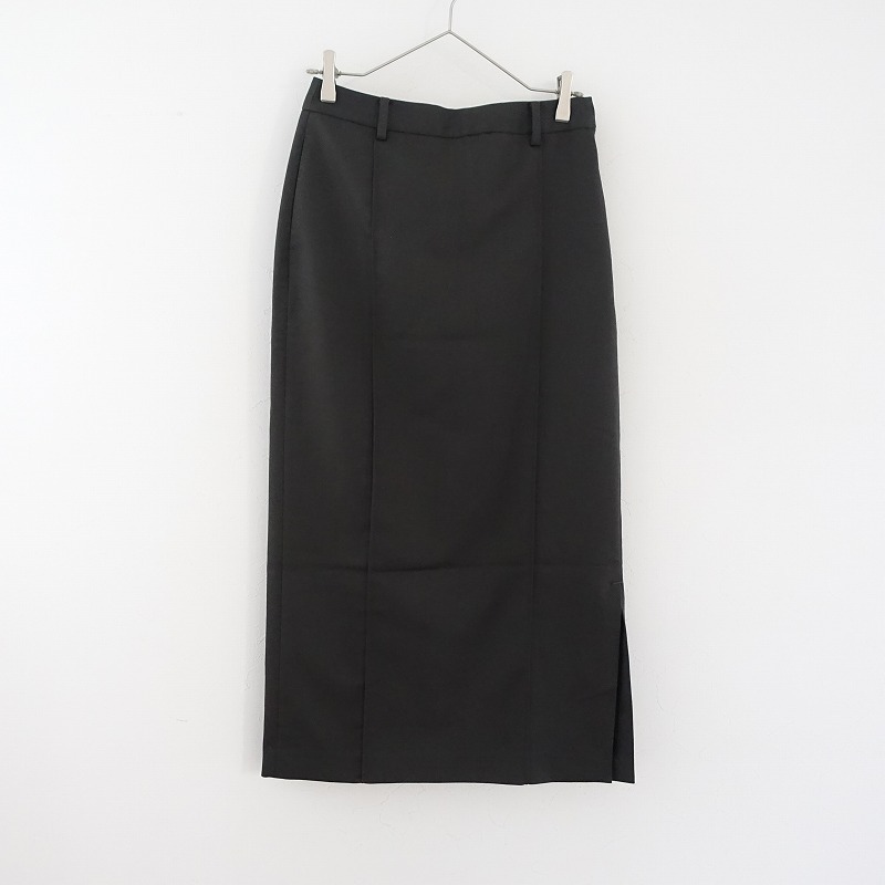 | 2022年秋冬コレクション IENAのペンシルタイトスカートです。カラーはチャコールで、薄手の素材です。前後とも左右にセンターシームが施されており、左腰サイドのホック&ファスナーで着脱でき、左裾サイドにスリット入りです。腰両サイドにシームポケットがあり、ヒップポケットはフェイクで、裏地付きです。定価(メーカー希望小売価格)16,500円の商品です。 |