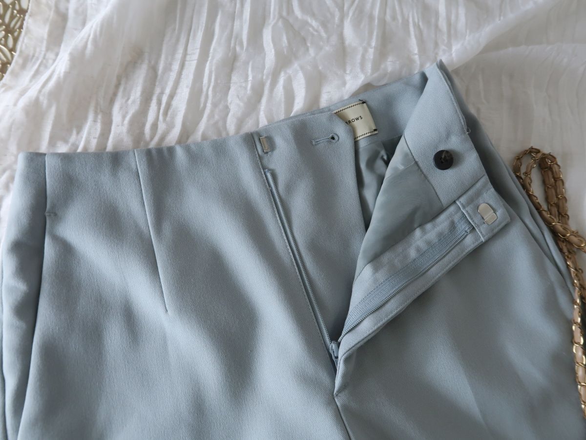 フロントホックとボタンとジップ開閉、両サイドとヒップにポケット付き。