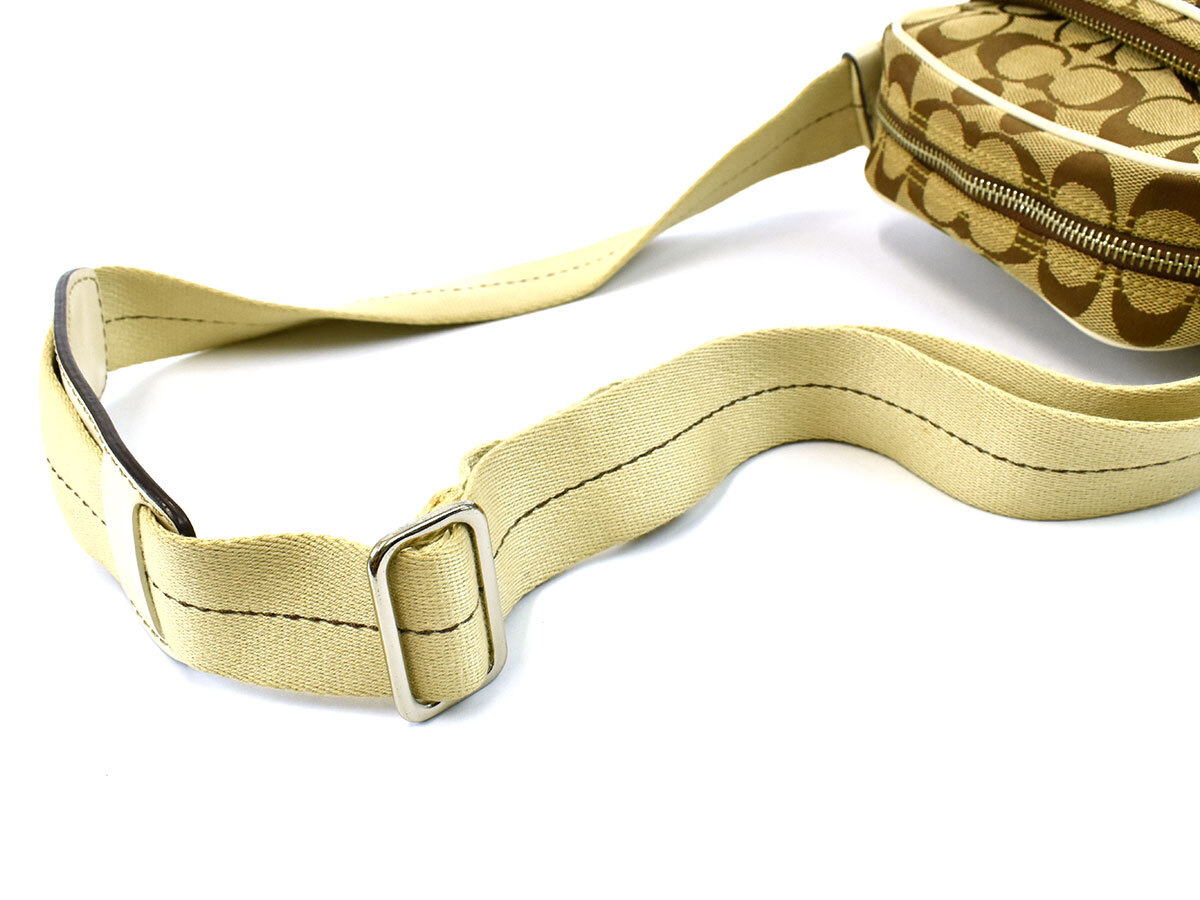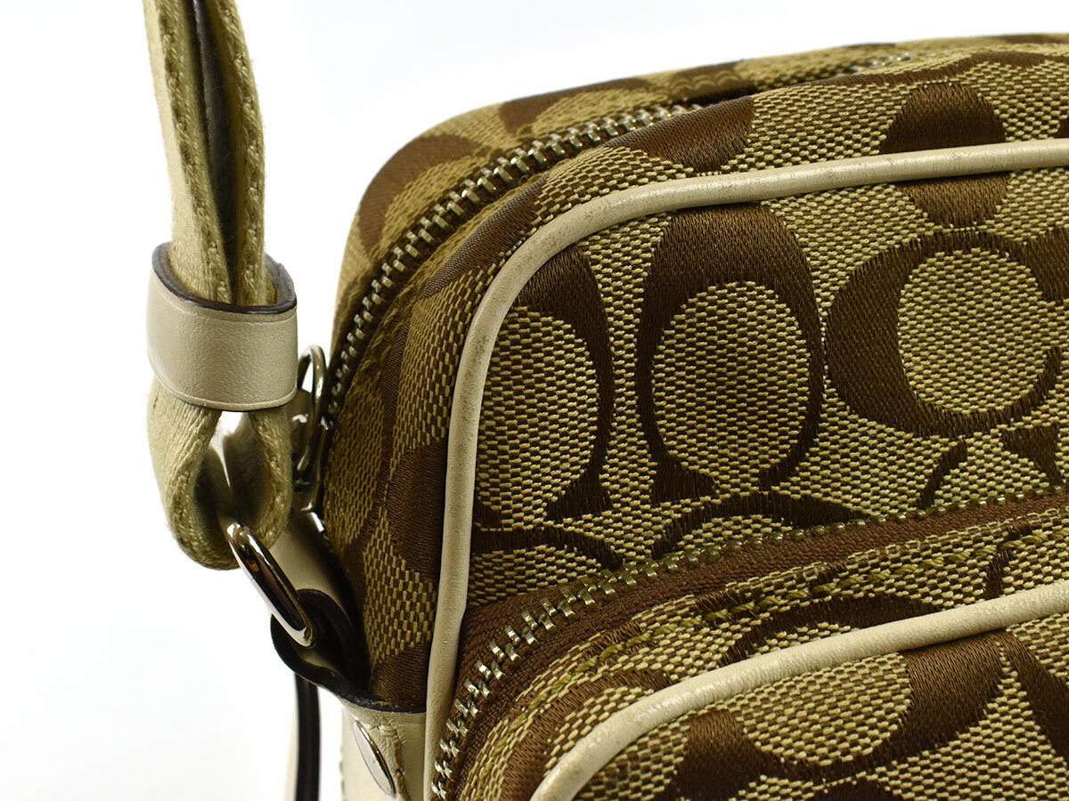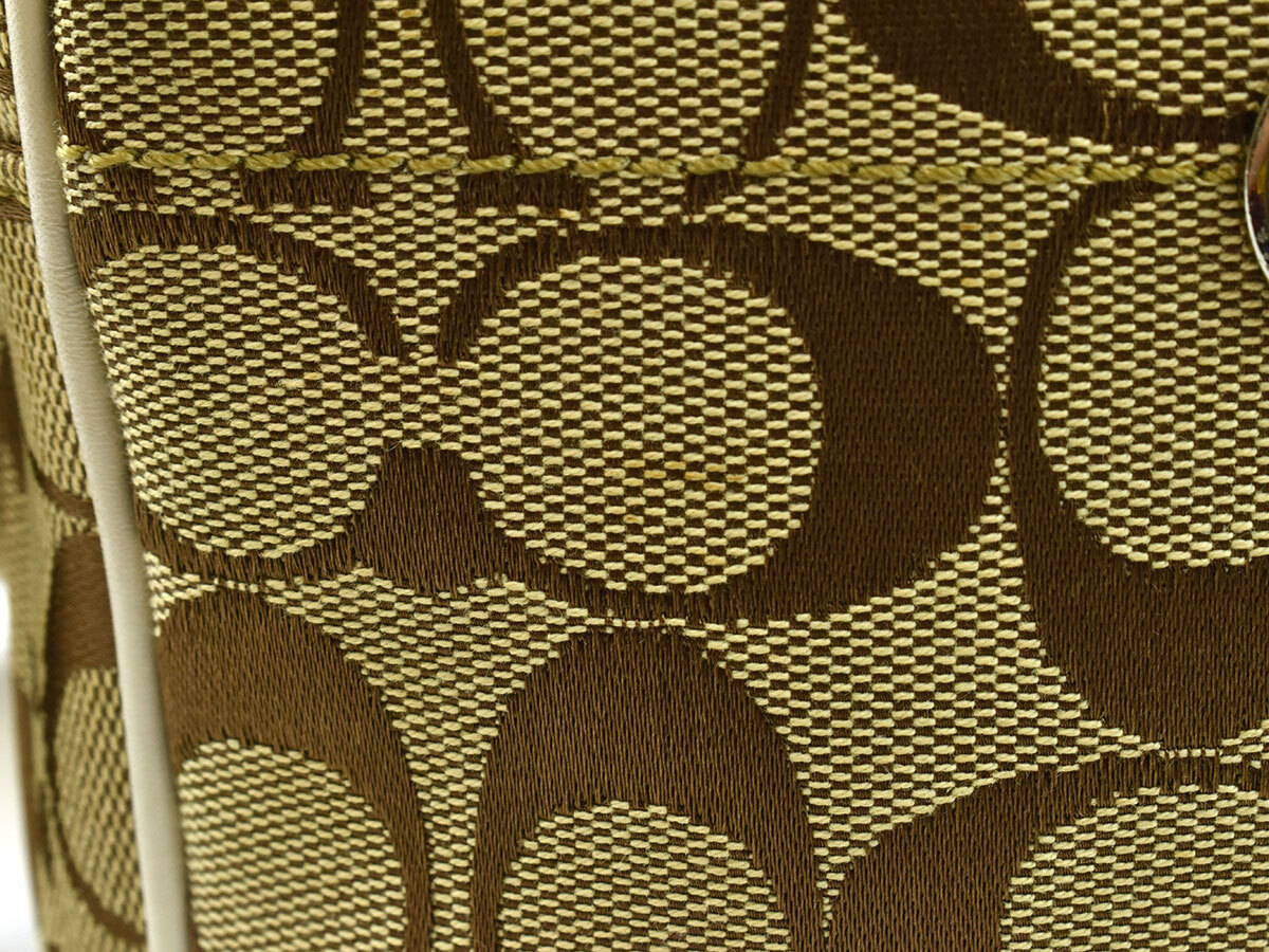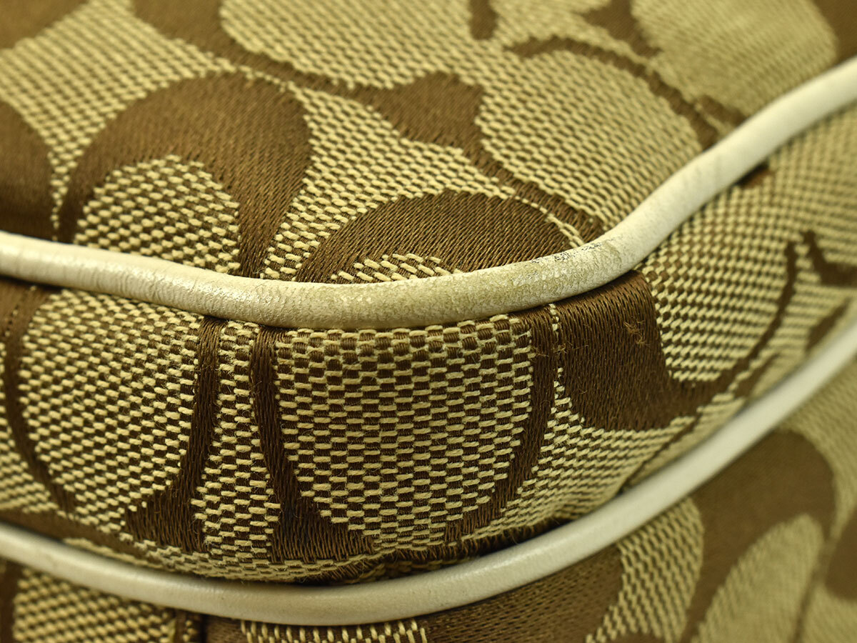 外側レザーに薄く黒ズミ、キャンバス所々に小さな茶色いシミ、金具に小傷がございますが、ご使用には差し支えなくまだまだお使いいただける商品です。 |