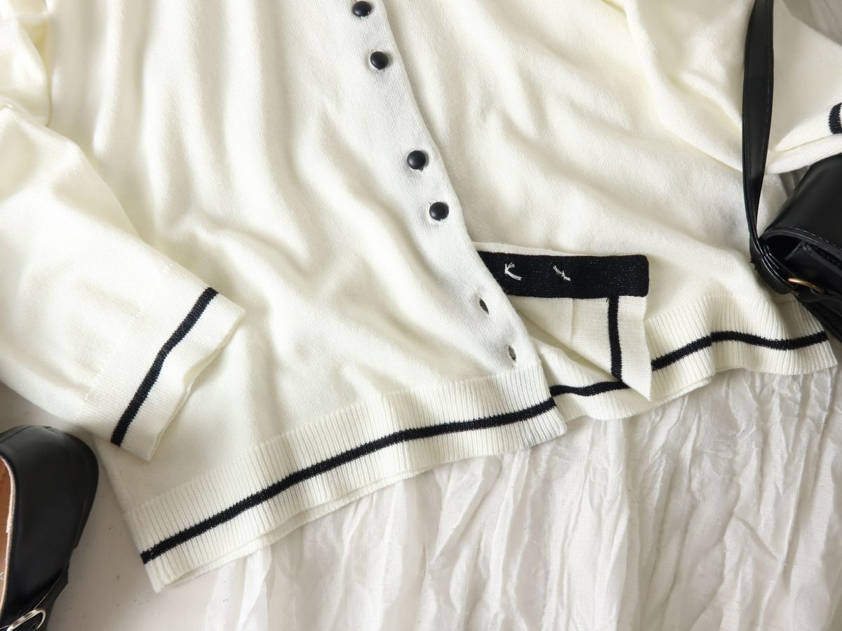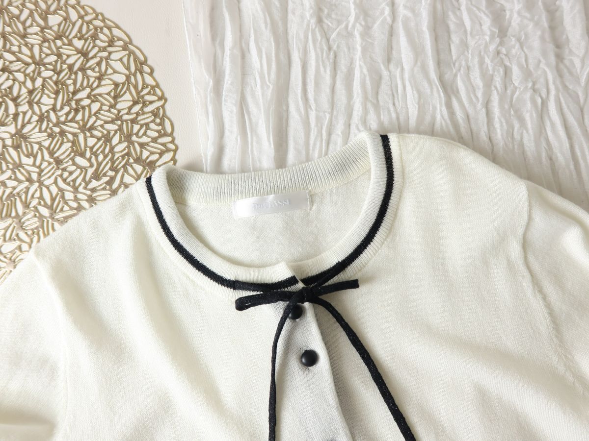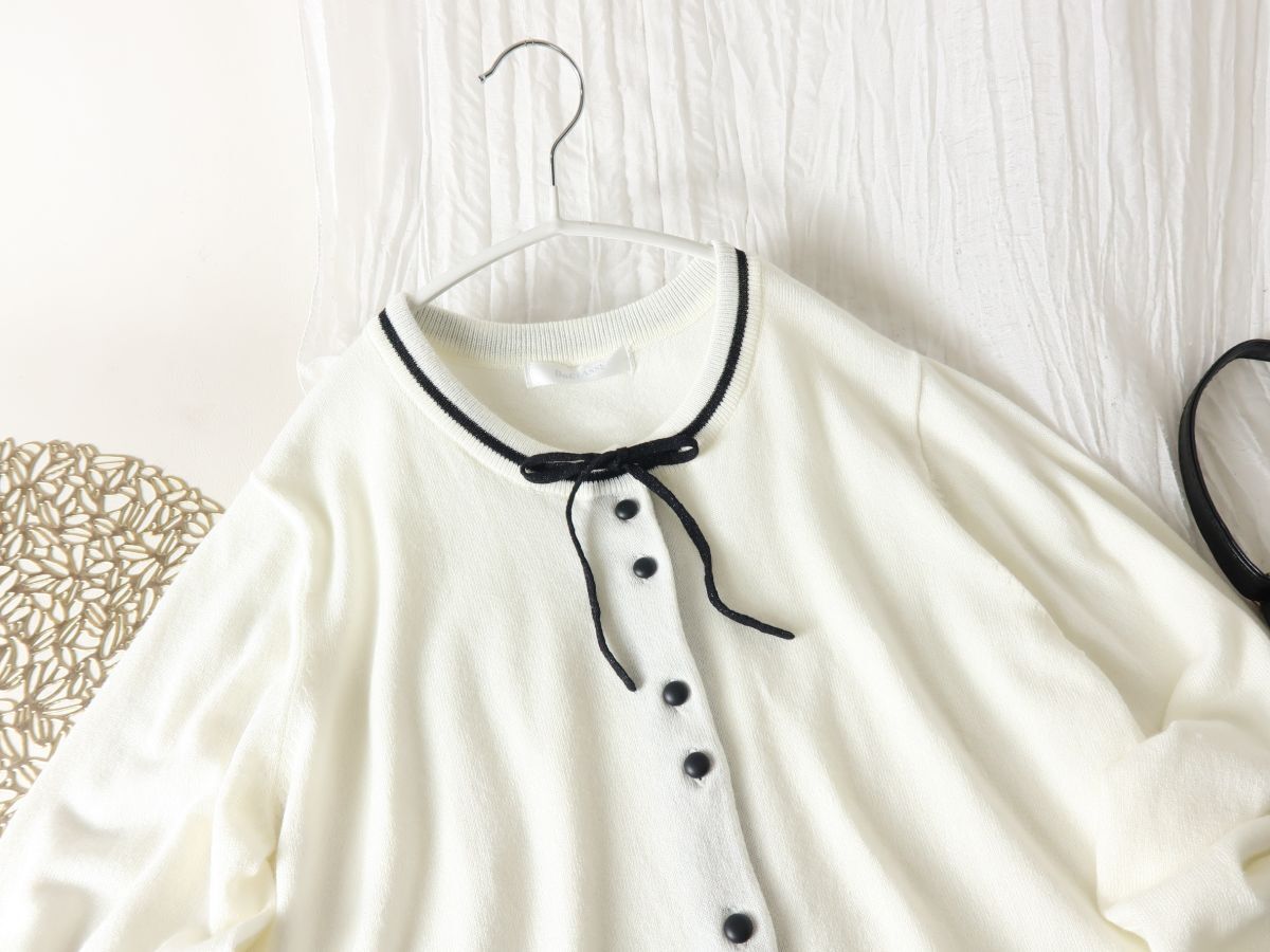 首もとに細リボンをあしらった、繊細なラメがきらめくクルーネックカーディガン。 シンプルなシルエットも、2つずつ並ぶボタンや配色ラインに個性が光ります。 ボタンは開けず、プルオーバー風に着こなすのが今の気分。