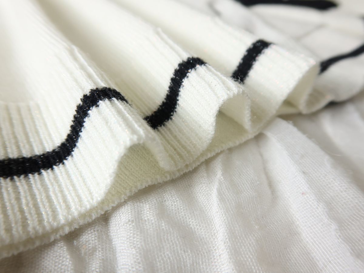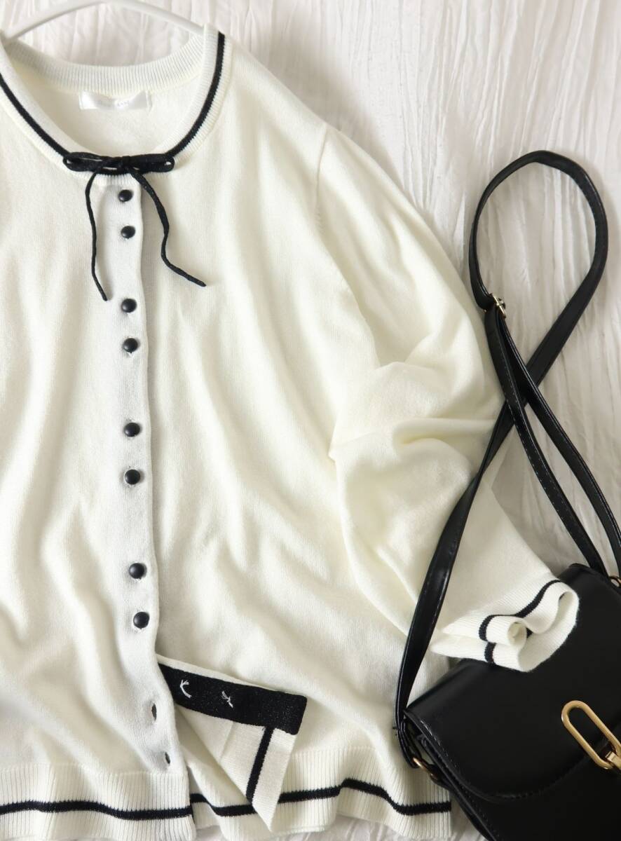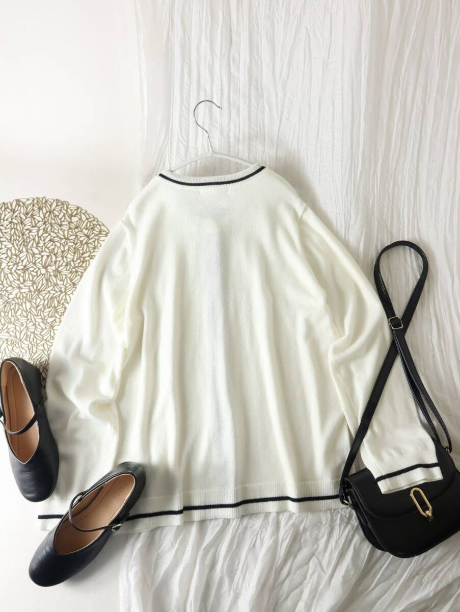 首もとに細リボンをあしらった、繊細なラメがきらめくクルーネックカーディガン。 シンプルなシルエットも、2つずつ並ぶボタンや配色ラインに個性が光ります。 ボタンは開けず、プルオーバー風に着こなすのが今の気分。