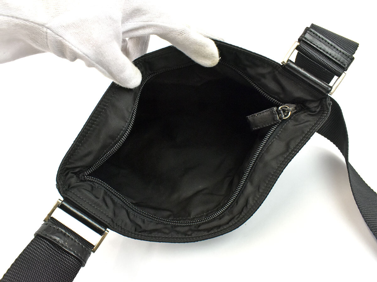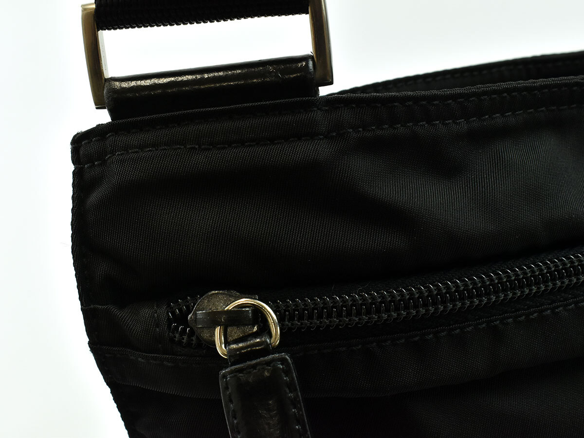 ナイロン全体にシワ、外側に僅かなラメの付着、レザーに若干の剥がれ、内側全体に薄い変色・かすかなベタつき、金具に小傷がございます。 やや使用感が窺えますが、ご使用には差し支えなく、まだまだお使いいただける商品です。 |
