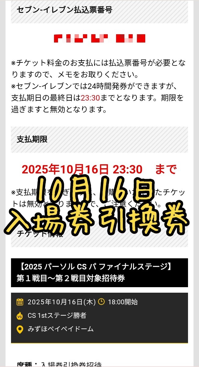 10月16日 ソフトバンクホークス クライマックス 入場券引換券 チケット