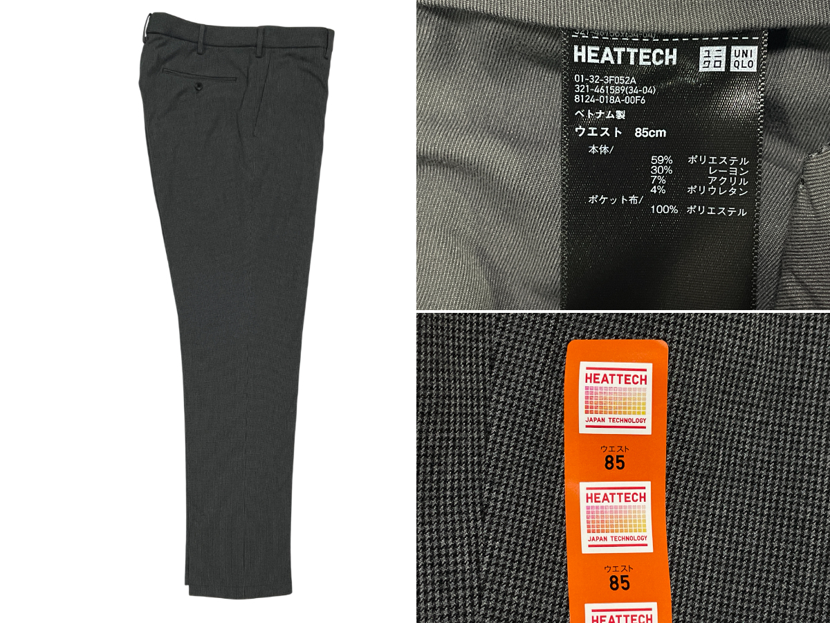 ブランド:ユニクロ 型 番 :321‐461589 カラー :千鳥格子(グレー) 状 態 :新品 新品 ユニクロ ヒートテック 千鳥格子柄 スラックス です。 吸湿発熱、保温機能を持つ「ヒートテック」素材を採用し作られた あったかパンツ です。 オシャレなマイクロ千鳥格子柄で、ストレッチも効き、動きやすく快適なパンツです。 サイズ表示シールは付いているのですが、紙の商品タグは外れております。新品未使用品です。サイズの合う方お勧めのパンツです。 ■サイズ:製品表記 85 ■サイズ:実寸(平置き) ウエスト 43.5cm 股下 81.5cm 股上 27.0cm ワタリ 31.0cm すそ幅 19.0cm | ||