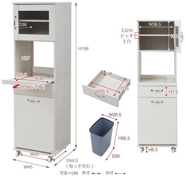 | 【カラー】 ナチュラル、ホワイト 【サイズ】 <外寸> 幅45×奥行44.5×高さ156cm <内寸> スライド部:幅38×奥行33.5×高さ37cm スライド引き幅:21.5cm 扉内:幅38.5×奥行38×高さ34.5cm 引き出し:幅35.5×奥行33×高さ6(有効7.5)cm ペール:幅20.5×奥行30×高さ36.5cm 可動棚:幅40.5×奥行36×厚み1.8cm(3.2cmピッチ3穴) 【材質】 天板:合成樹脂化粧合板(PVC) 前板:合成樹脂化粧パーティクルボード(PVC) 本体:プリント紙化粧合板 ガラス:生ガラス 【耐荷重】 天板:(約)10kg以下 可動棚:(約)10kg以下 スライド:(約)9kg以下 引き出し:(約)5kg以下 フラップダウン扉:(約)5kg以下 【生産国】 中国 【梱包】 2梱包でお届けします。 2-1 サイズ:86.5×47×24.5 cm 2-2 サイズ:39×30×55 cm 合計重量:30.9kg 【その他】 ・可動棚:1枚 ・14Lペール2個付き ・背面化粧有り ・キャスター4個(うちストッパー2個) 【組み立て品】 お客様による組み立てが必要です。 |