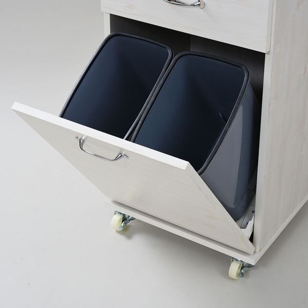 | 木目調とガラスのカントリーテイストが可愛いリュッカランドのキッチンシリーズ。 斜め開閉の下部には付属のペールが2つ収まる収納部を完備!ゴミの分別もばっちり。 |