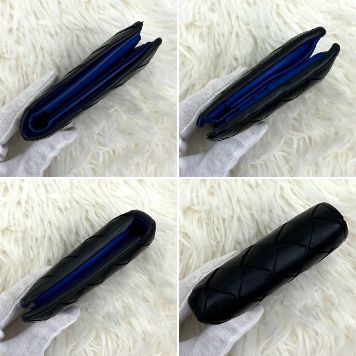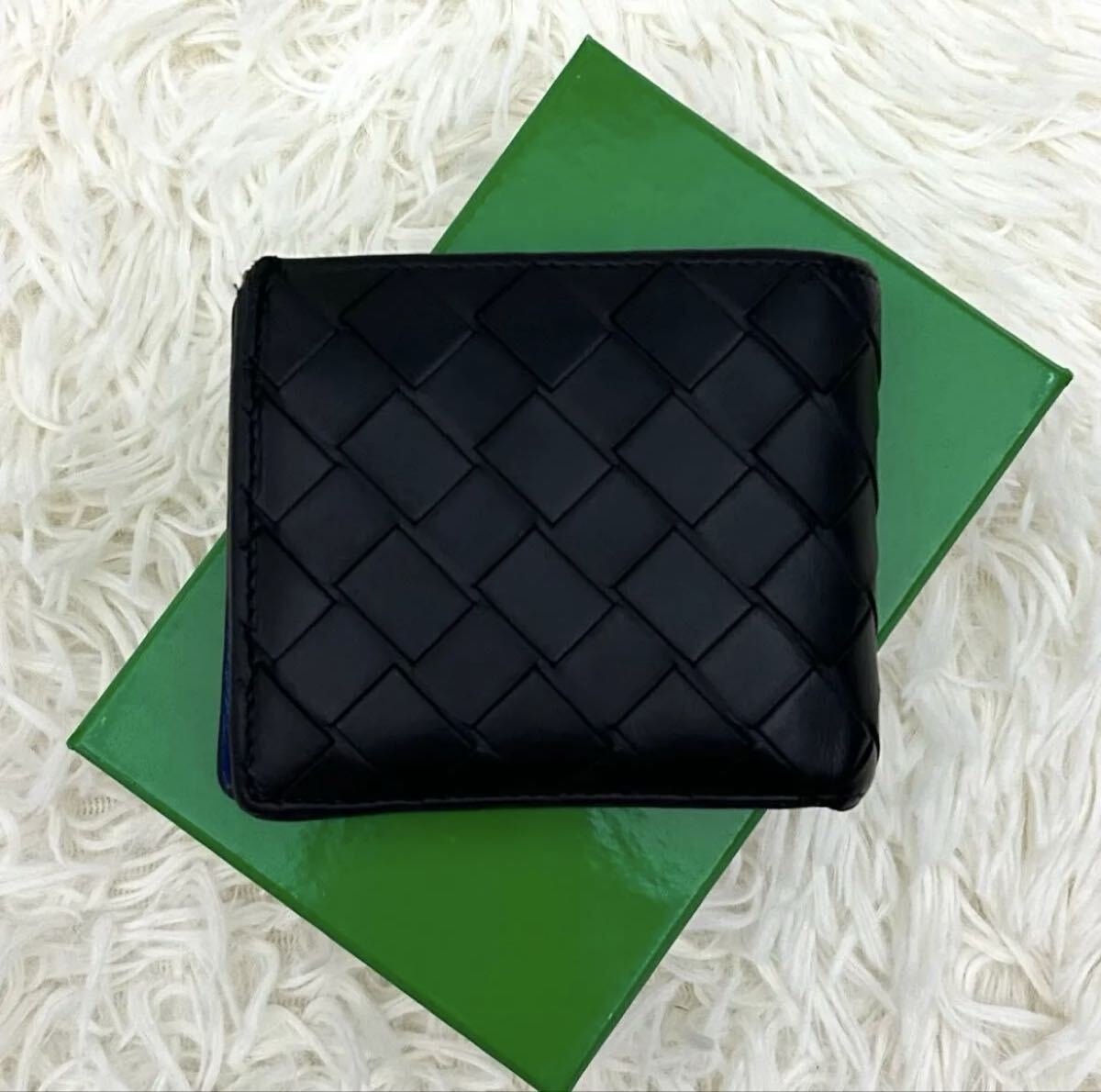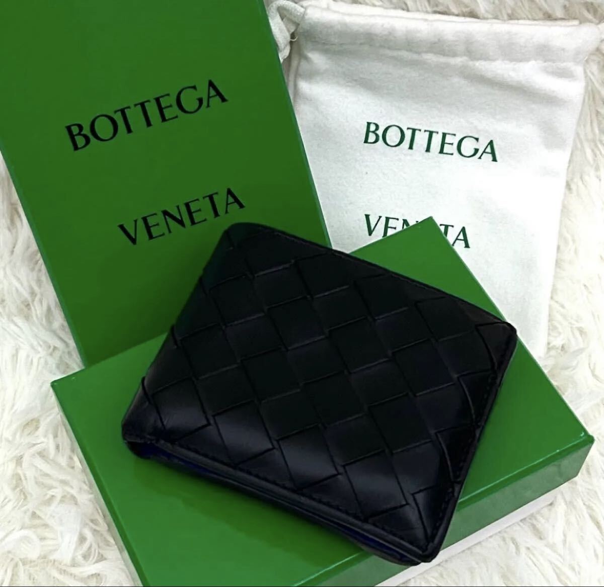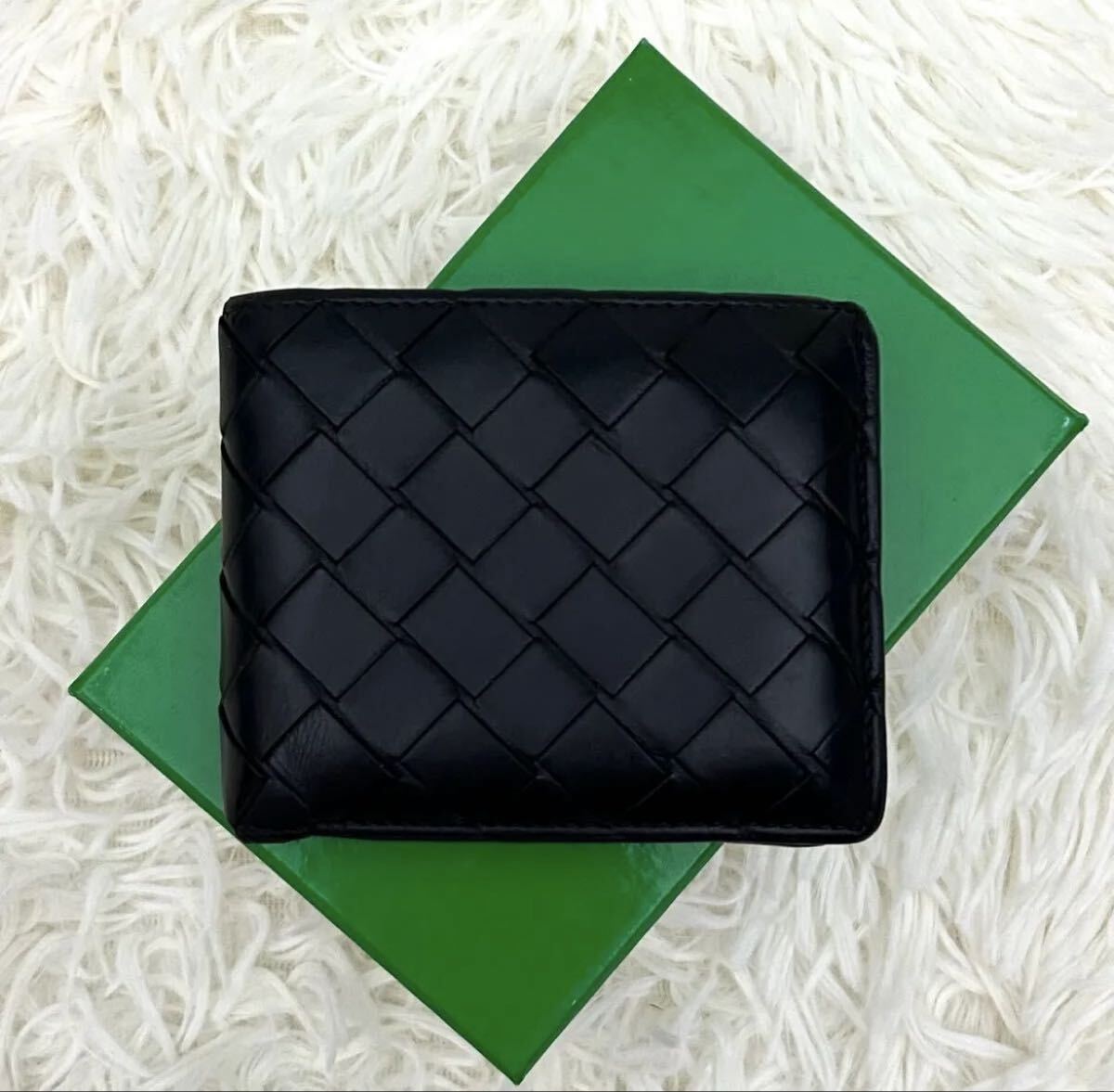 ブラックのイントレチャートレザー二つ折り財布、Bottega Venetaのスタイリッシュなデザイン。