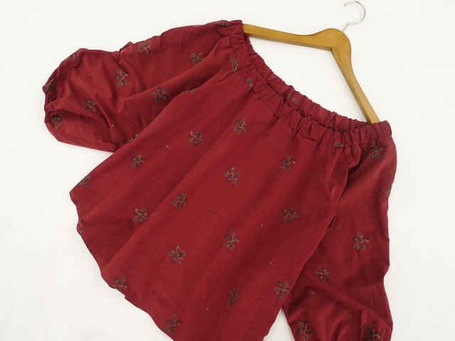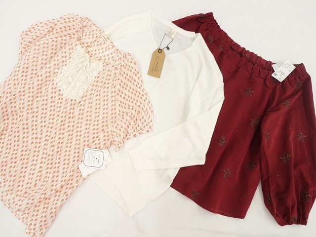 九分袖ブラウス+半袖プルオーバーブラウス+長袖ニットカットソー LL相当 ボルドー地 グリーン×ゴールド×レッド 総柄刺繍/ピンクベージュ地 ベージュドット&オレンジ系花柄&アイボリー総柄/オフホワイト