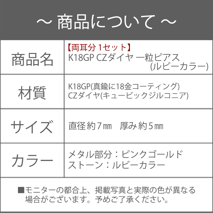新品/ピアス/K18GP/ルビー/ダイヤ/18金/ピンクゴールド/レディース/両耳/スタッド/一粒/CZ/カラーストーン/シンプル/上品/女性/PG