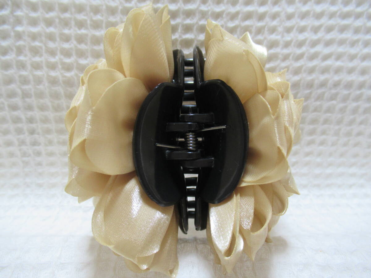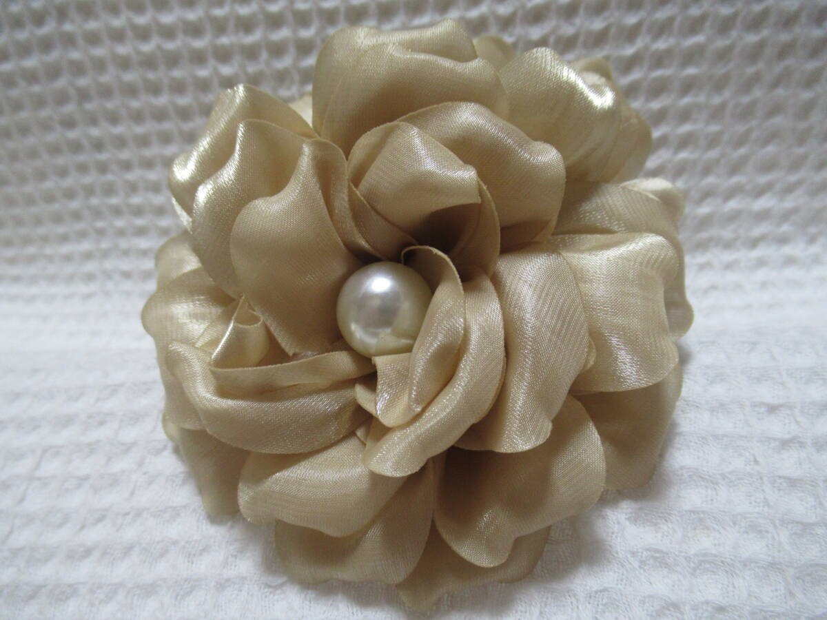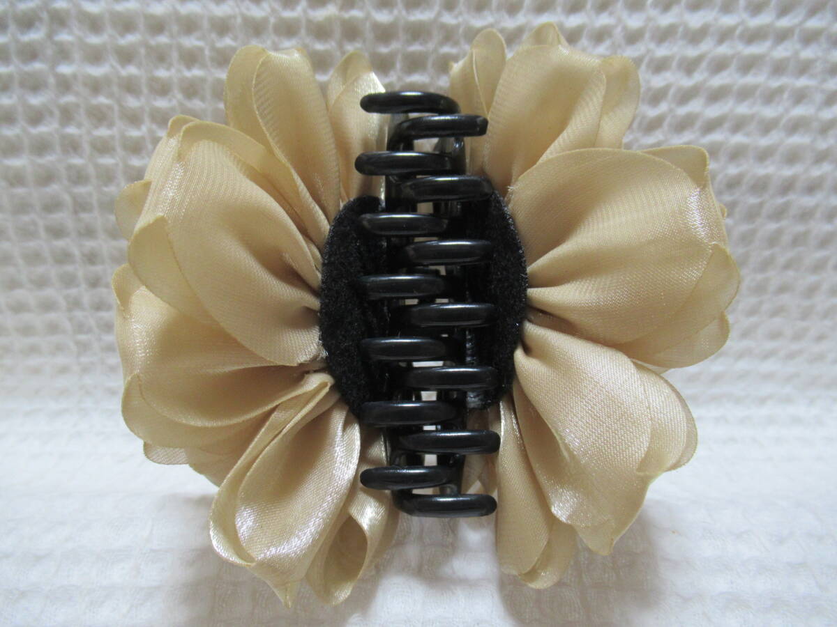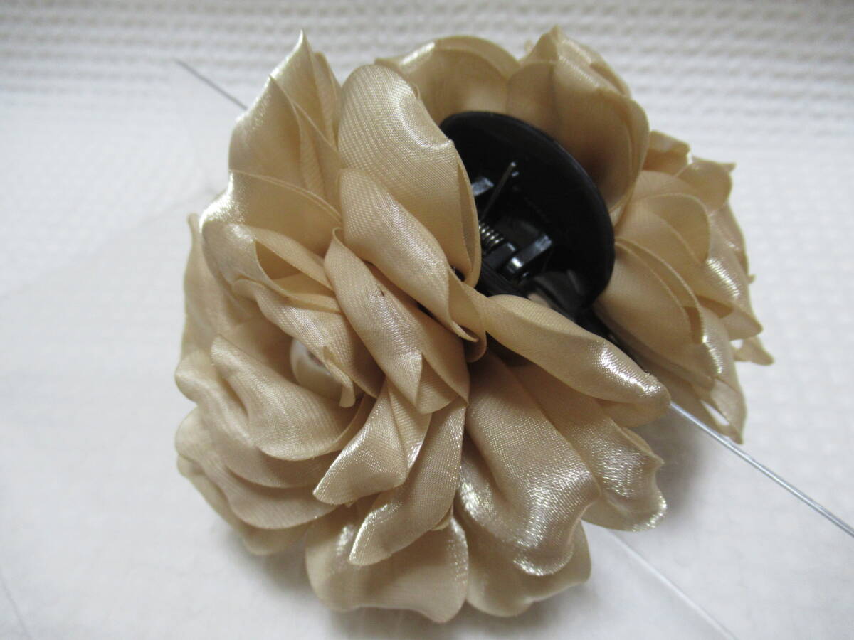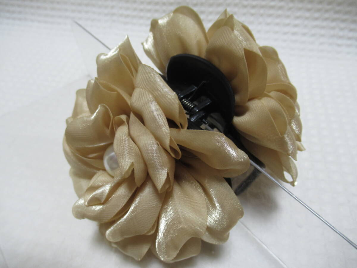 パール付きベージュ系色生地の花型付き バンスクリップ
