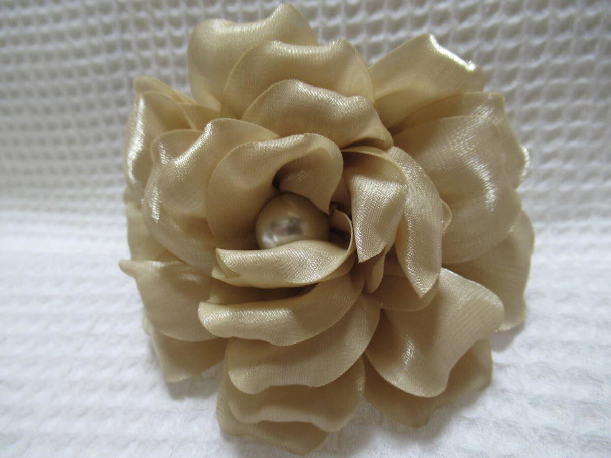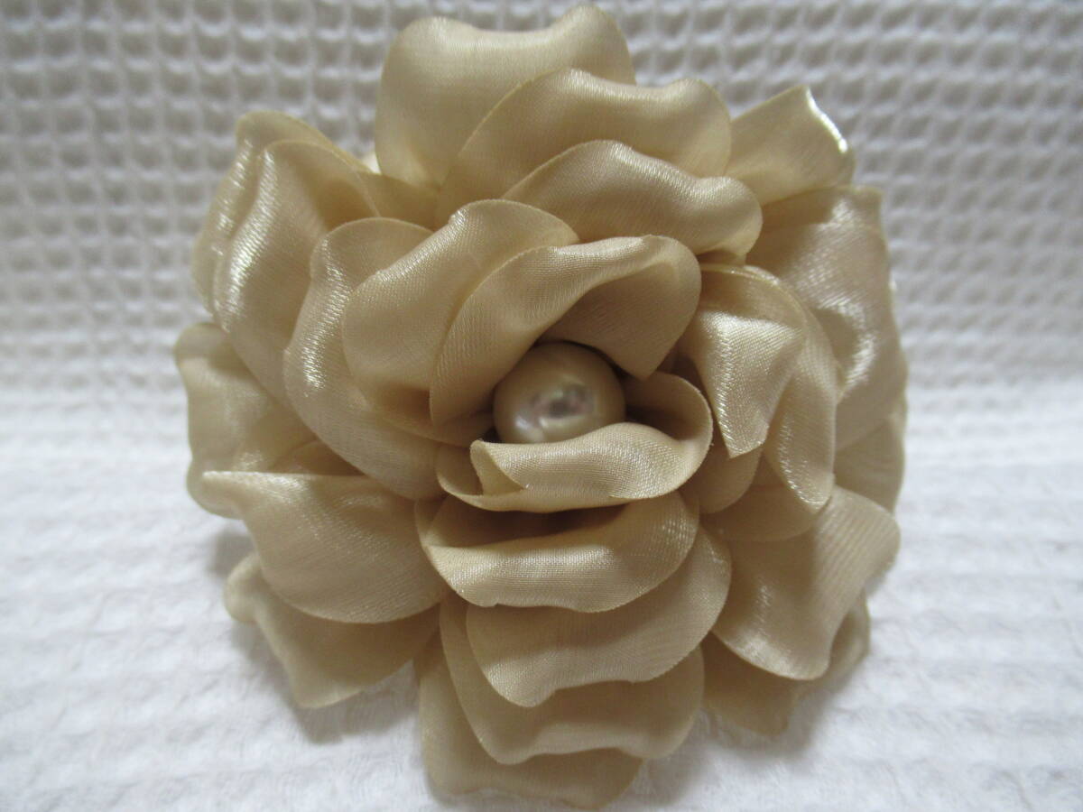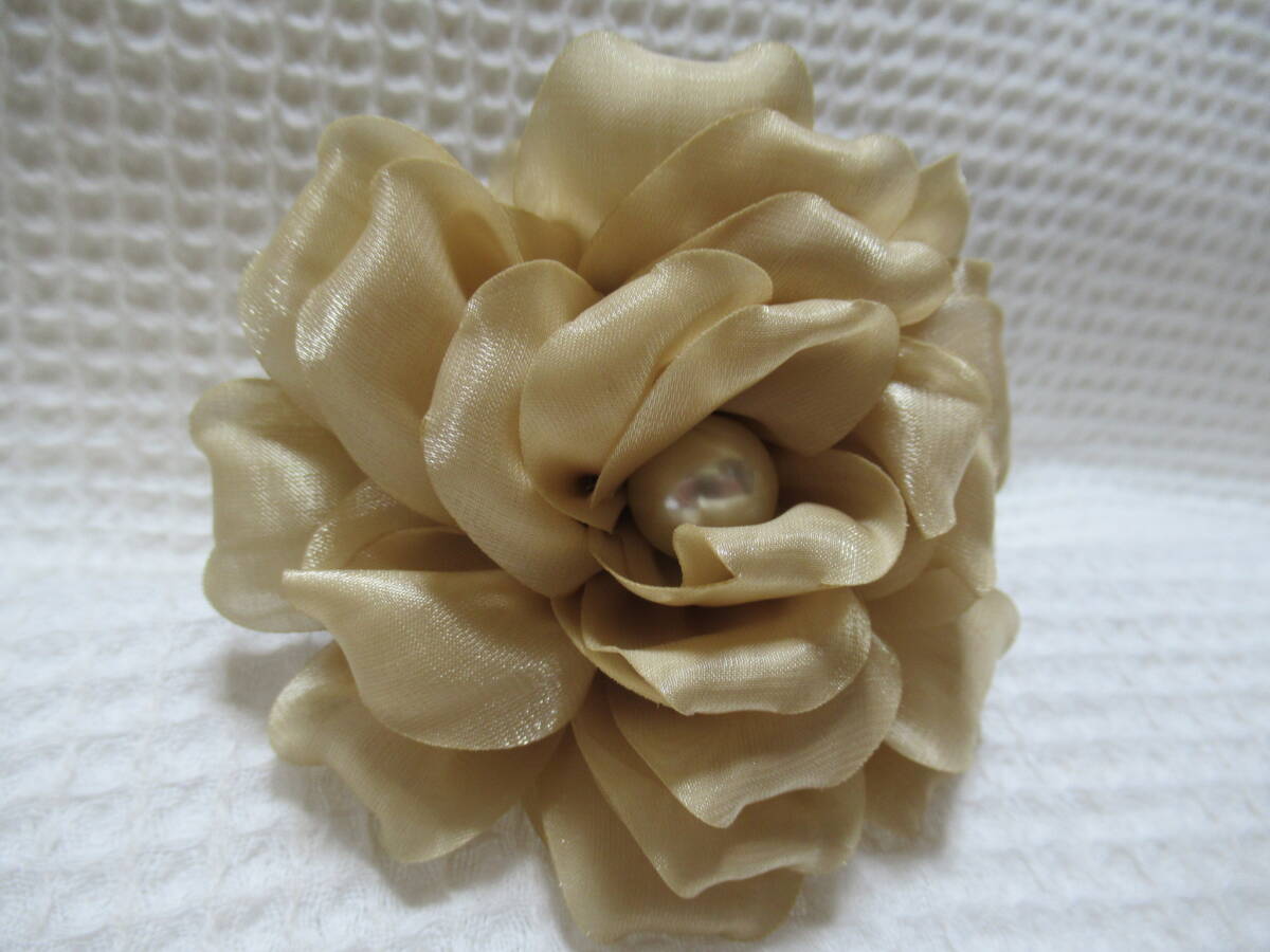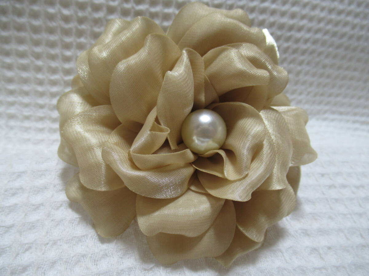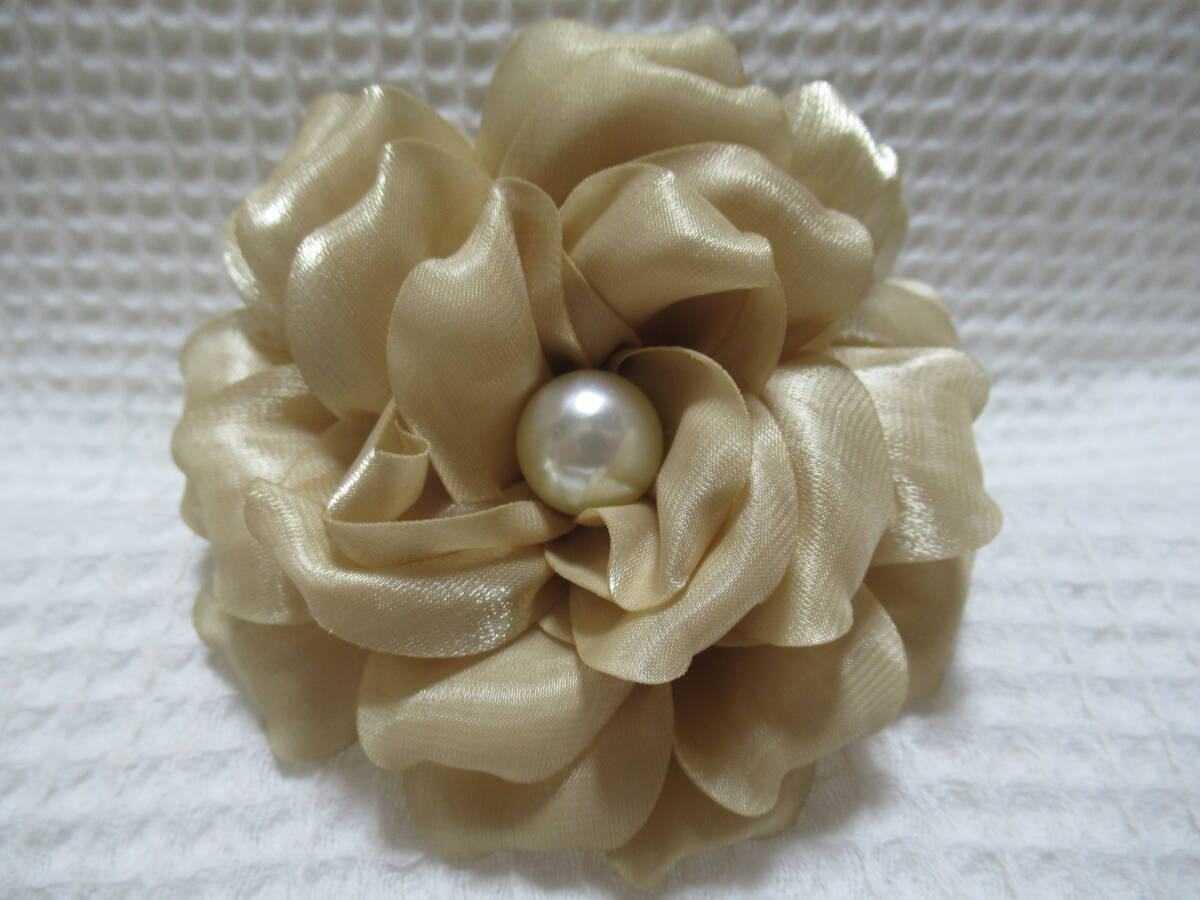 パール付きベージュ系色生地の花型付き バンスクリップ