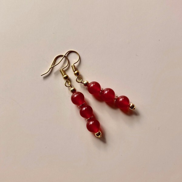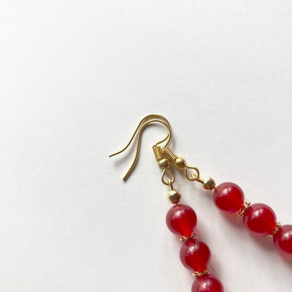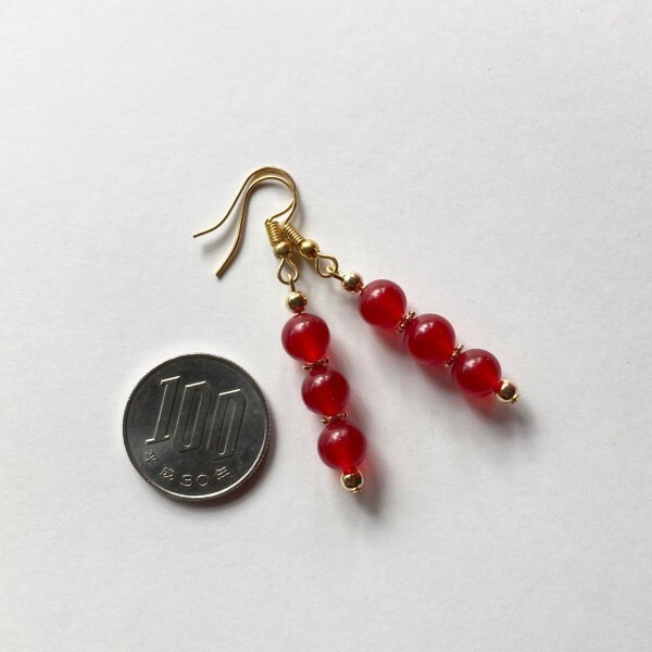 こちらは、8mm玉のレッドジェイドジェイドを3個並べたフックピアスです。シンプルなデザインですのでコーディネートにも合わせやすいデザインで、使い勝手がいいアイテムとなっております。気になる方は是非この機会にどうぞ。