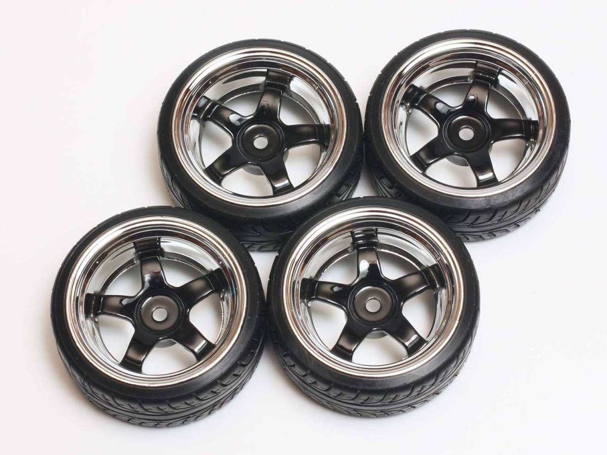 1/10 旧車向け ドリフト用 パターン付きタイヤ組込済み 激深リム クローム/ブラック5スポークホイール4本セットです。