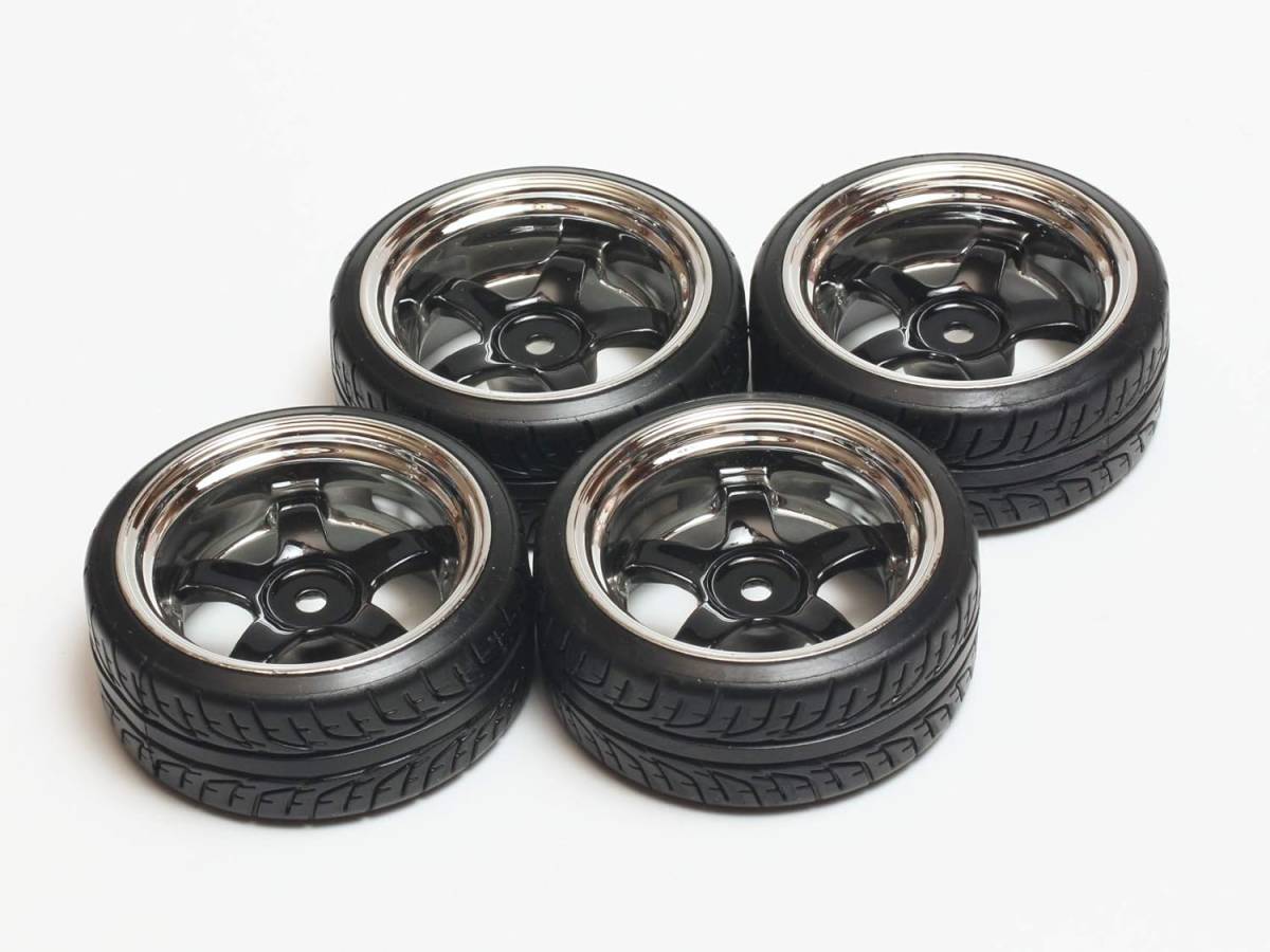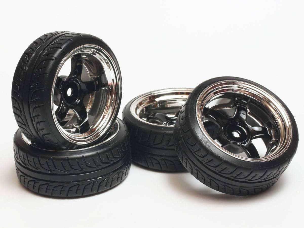1/10 旧車向け ドリフト用 パターン付きタイヤ組込済み 激深リム クローム/ブラック5スポークホイール4本セット
