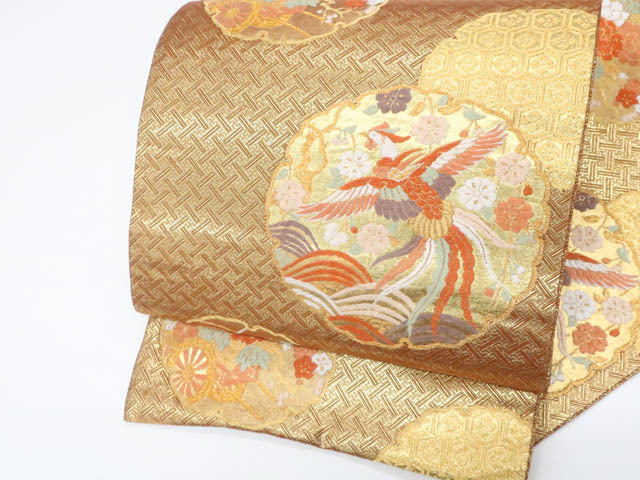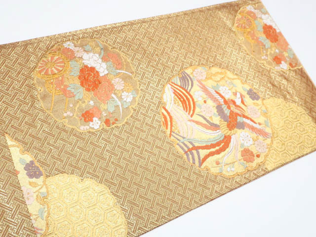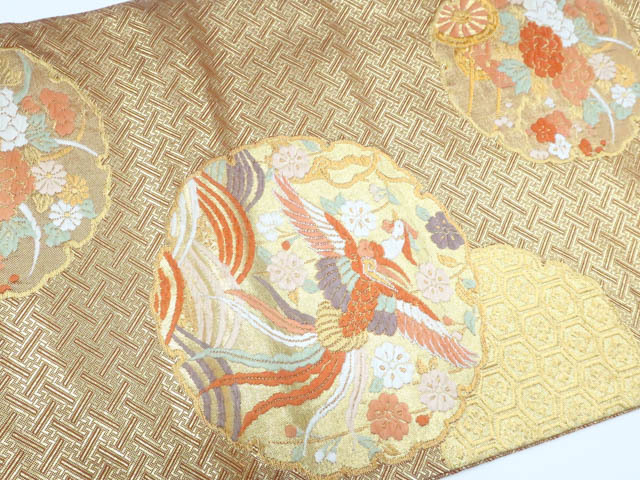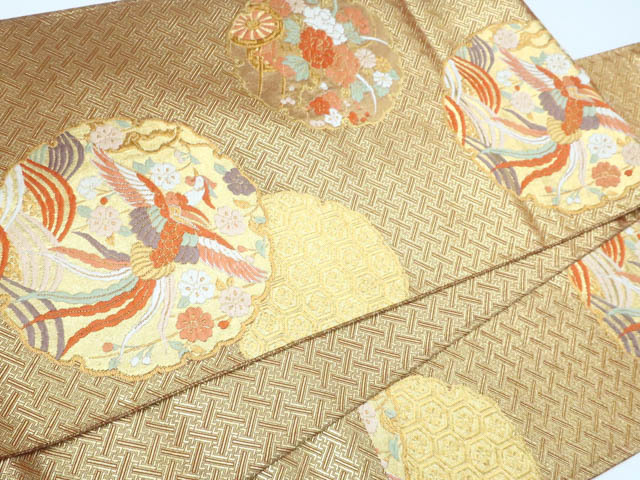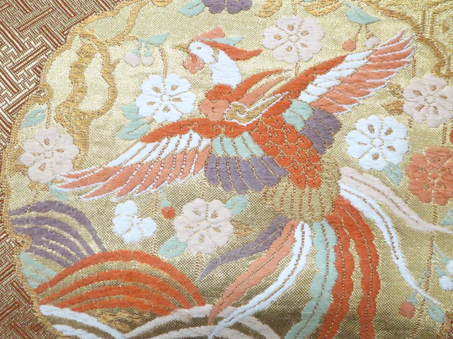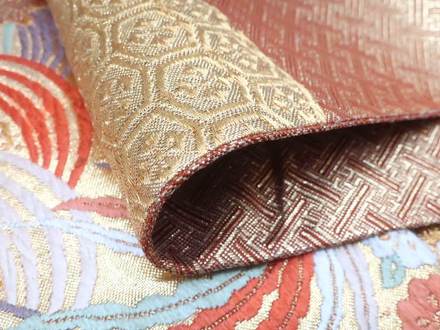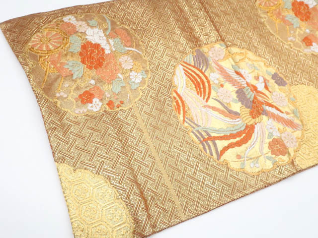 リサイクル商品の為、垂れ中に記名、全体に擦れ、前柄付近に金糸の飛び出し、若干のほつれがございますがご着用いただけると存じます。 地色は金です。 1枚目の画像が近いお色かと思われます。 素材は正絹です。 |