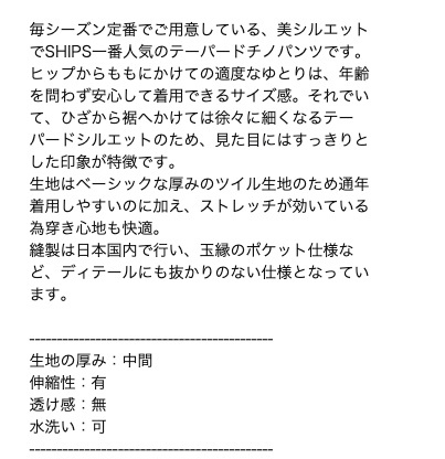 SHIPS 定番のパンツです。足のラインが綺麗にみえるテーパードシルエット。トレンドのゆったりサイズのTシャツなどに合わせてもバランスよくまとまります。オールシーズン使えるのもポイント◎状態美品。