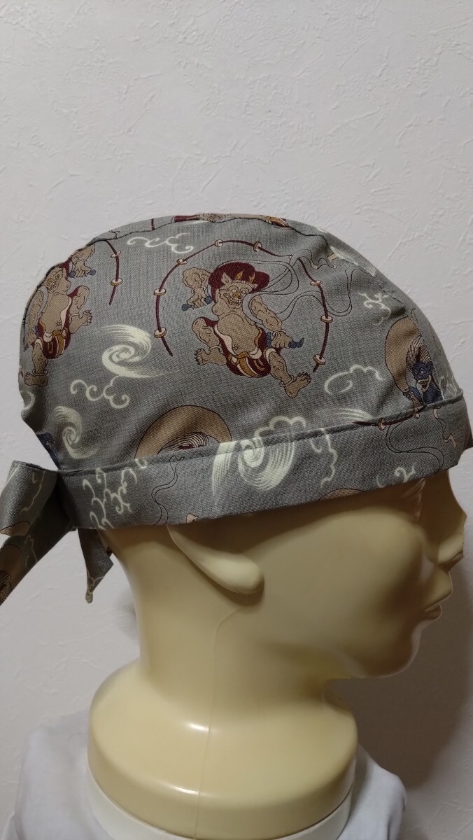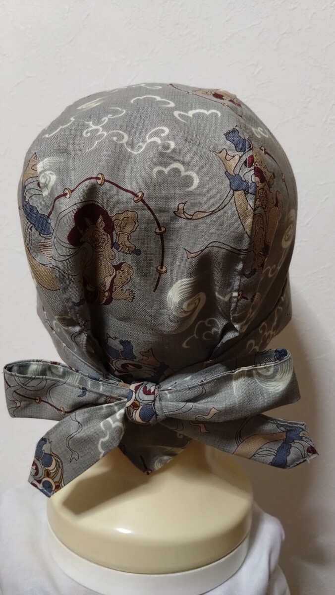 短★バンダナキャップ★ハンドメイド 和柄 風神雷神 グレー