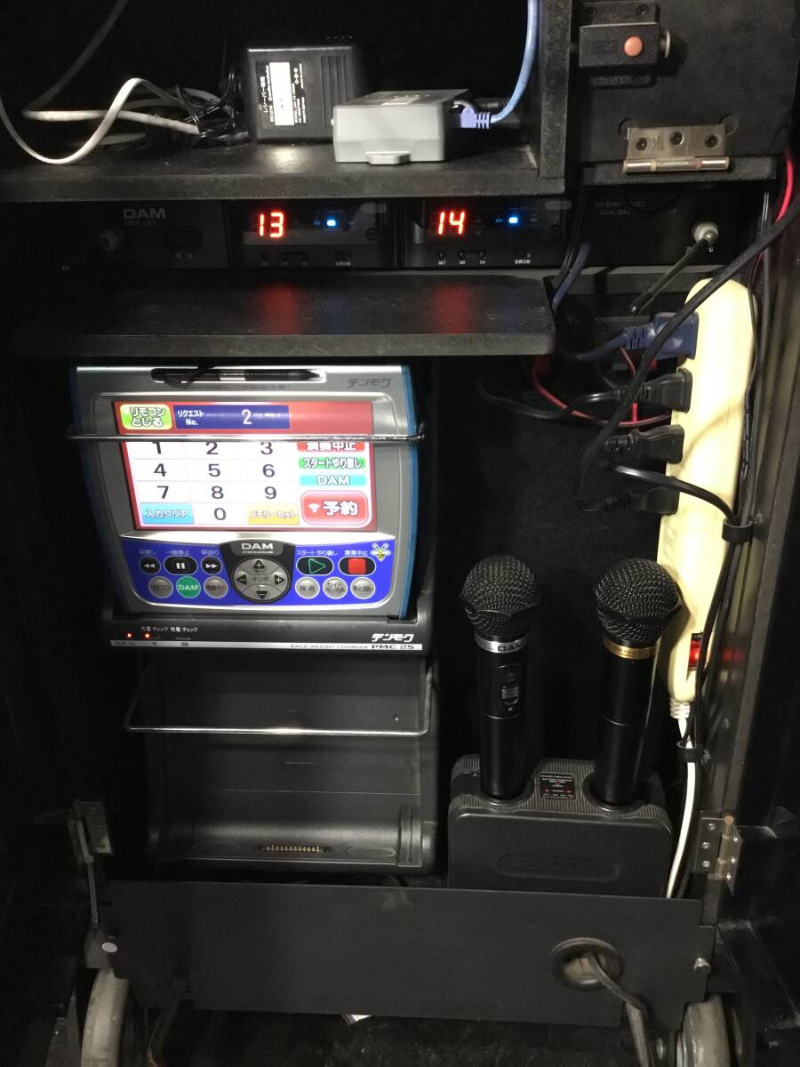・付属品:ワイヤレスマイク2本、マイク充電台、デンモク(DAMリモコン)、モニタースタンド付き液晶ディスプレイ、ケーブル一式(写真に写っているものが全て)