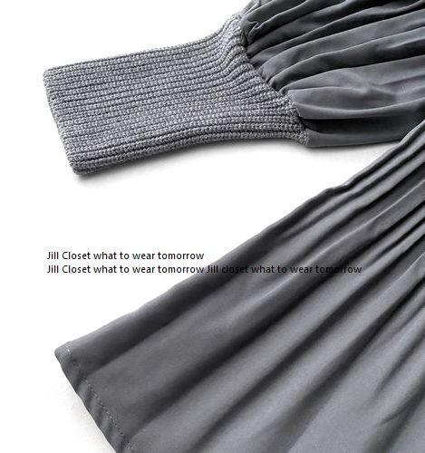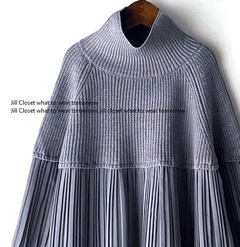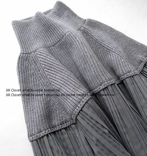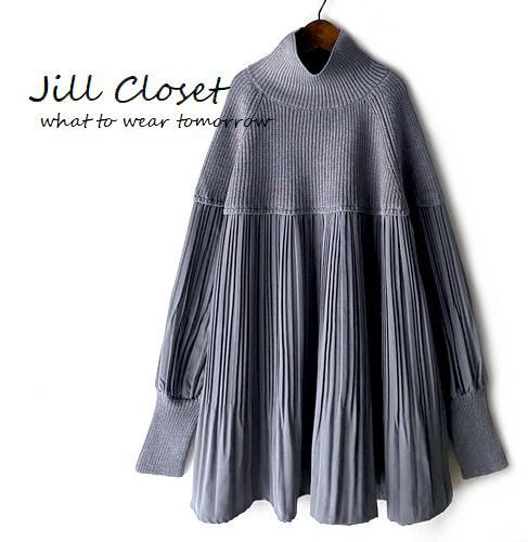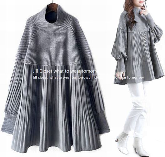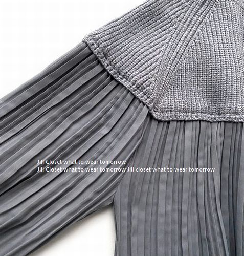 新品【送料185円】GRAY 伸縮◎リブニット×プリーツ加工ブラウス*異素材切り替えdesign*ハイネック プルオーバー*チュニック3167