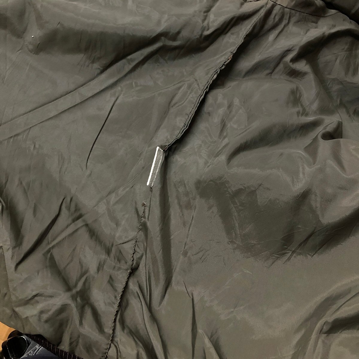 中古品です。使用感があります。全体的に経年による擦れや変色やひび、袖や裾リブにホツレ、裏地首周りや両脇腹や脇など所々にリペア跡があります。