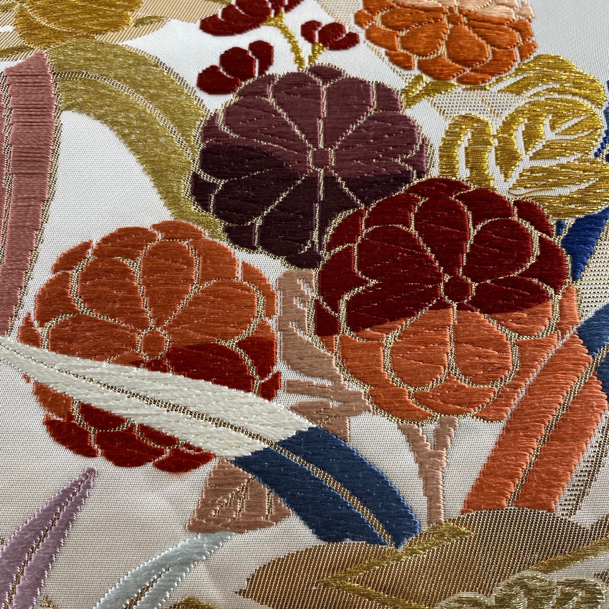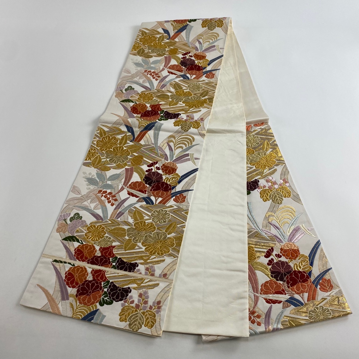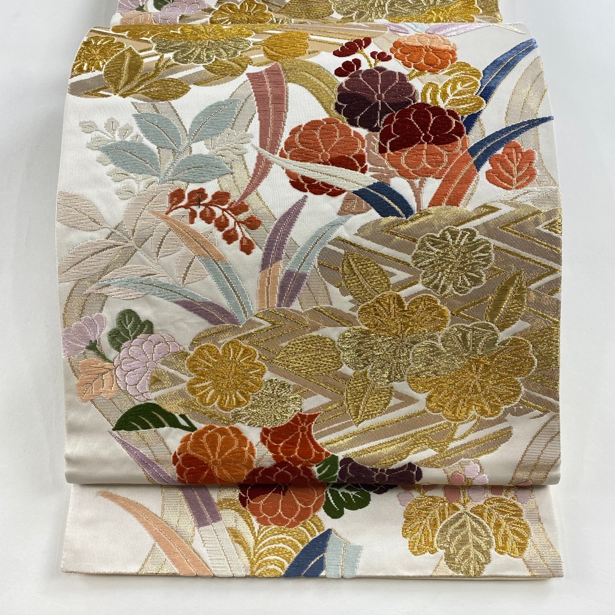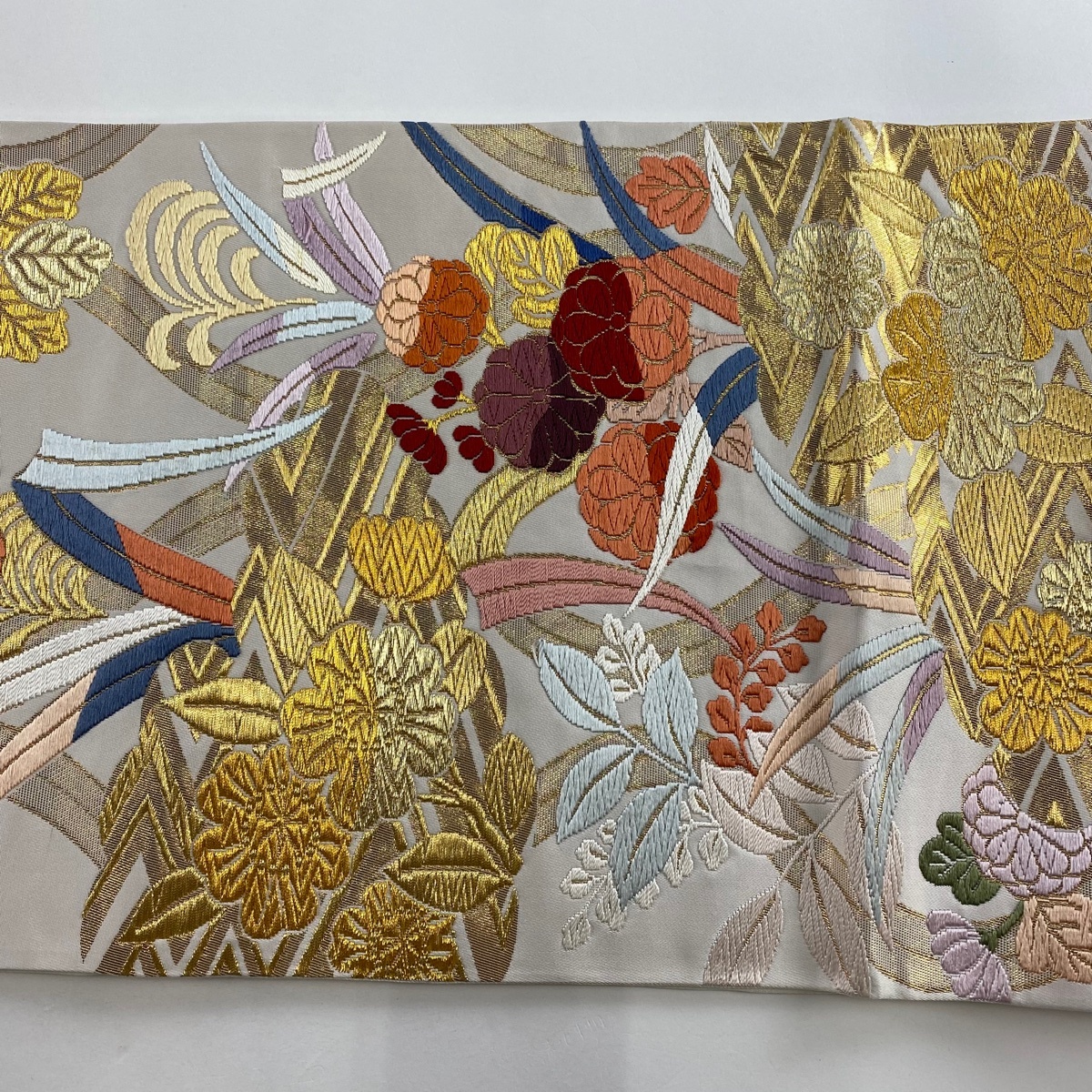 | 袋帯 秀品 落款 草花 雲文 金糸 唐織 クリーム 六通 正絹 【中古】 |